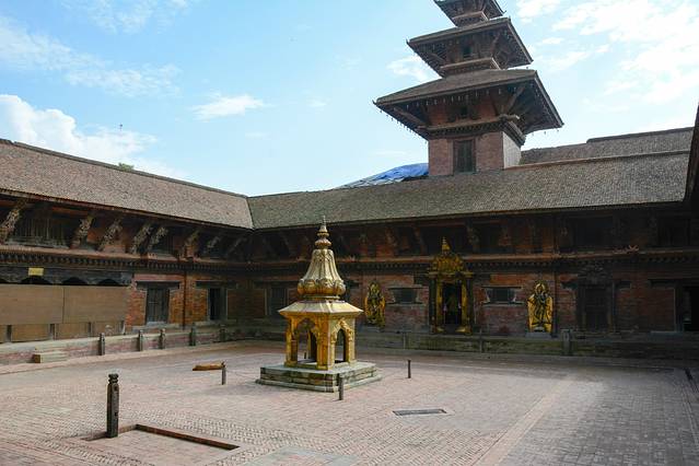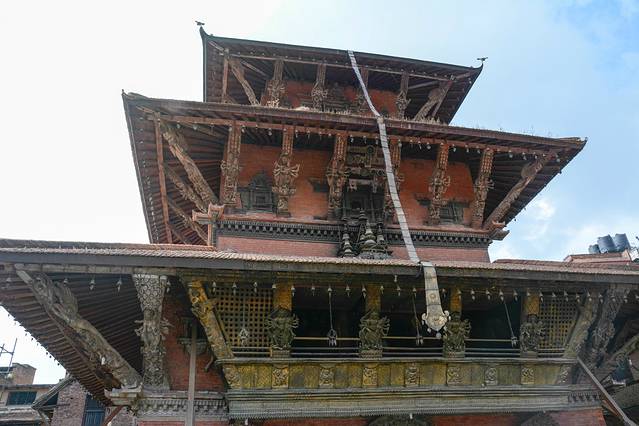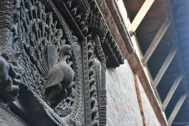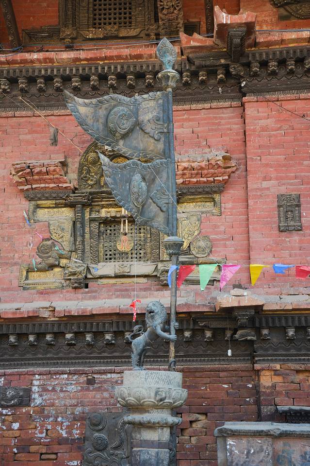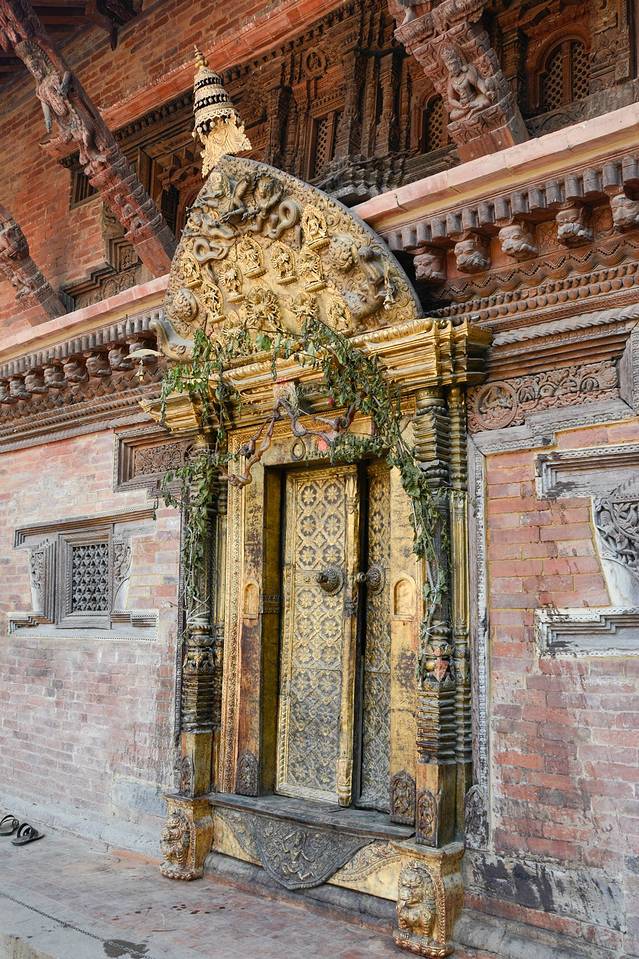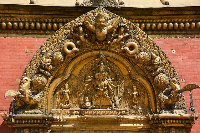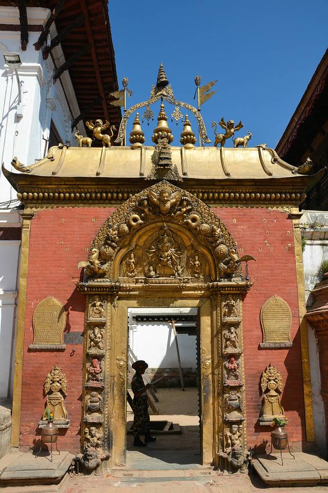 金门上镀金的三角墙上有一尊精美的迦卢荼像,下方是一幅四头十臂的Taleju Bhawani女神像。Taleju Bhawani女神是马拉王室女神,在加德满都、帕坦和巴克塔普尔的王宫广场都有供奉她的寺庙