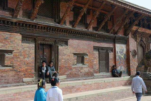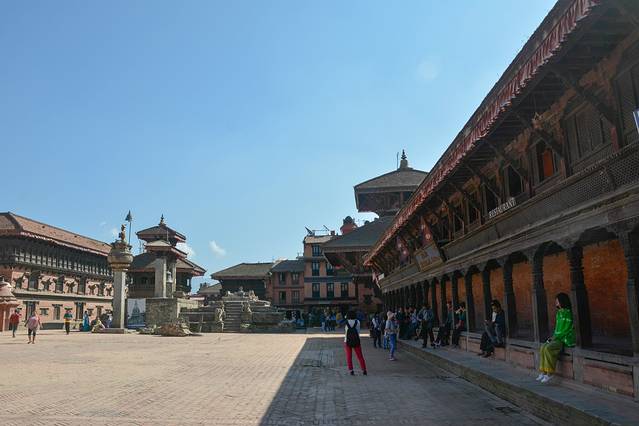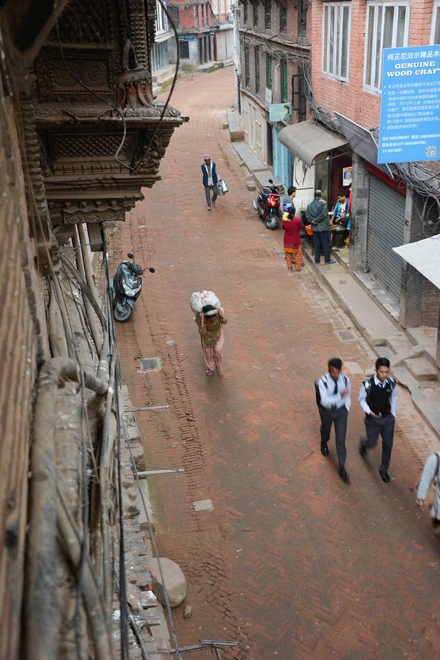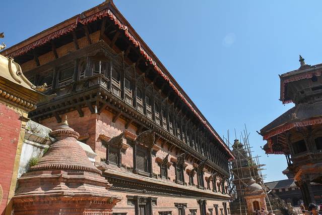从小巷穿过就来到了杜巴广场,也是前一天晚上进入古城第一个经过的广场。巴克塔普尔的杜巴广场是三座杜巴广场中面积最大的,但这里略显空旷,广场中央有一很大的空地,主要建筑都在四周,其中部分建筑还因去年的地震未及时修复而被木架支撑着。据说这里曾经也塞满了寺庙和建筑物,只是1934年那场大地震将这些都摧毁了。