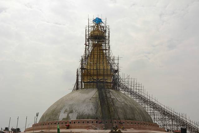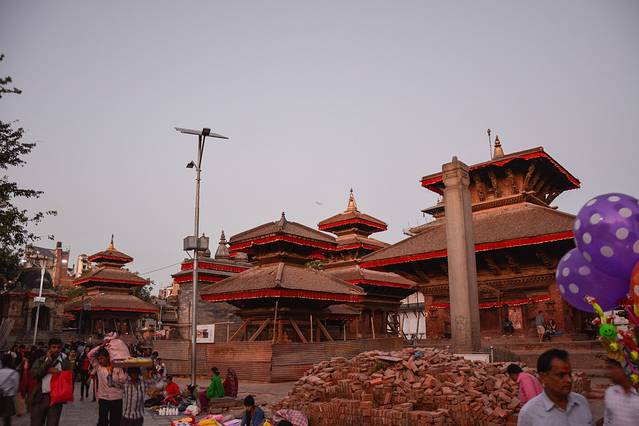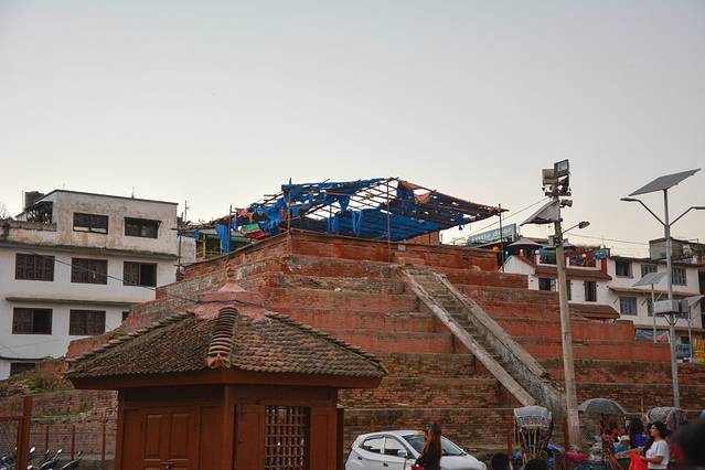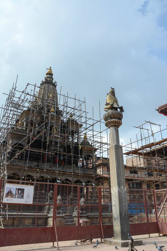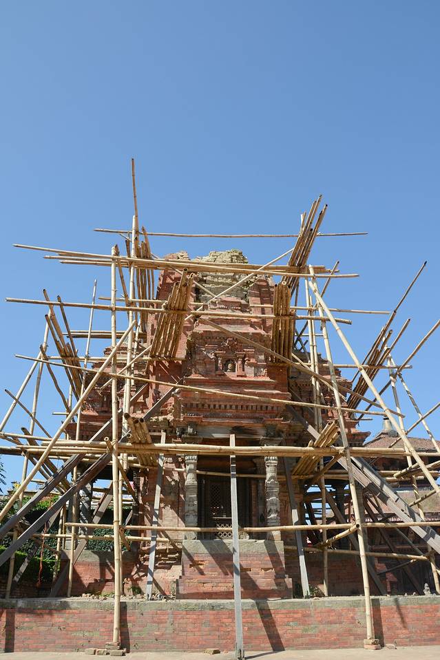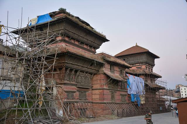 然而加德满都的杜巴广场也是去年地震中损毁最为严重的一座,大部分建筑坍塌,其中独木庙、玛珠庙完全坍塌,老皇宫部分坍塌,为危险建筑,还有许多神庙也都支上了架子。