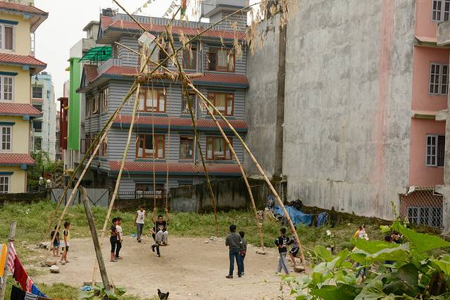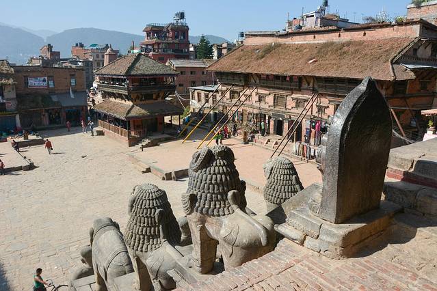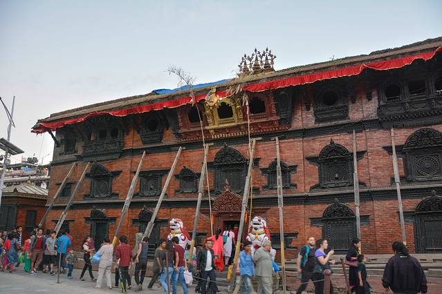 站在尼亚塔波拉神庙高高的台阶上,对面便是巴依拉布纳神庙这座先后分三次建成的神庙高峰的时巴依拉布,即湿婆神的恐怖化身。在神庙墙边还能看到Bisket Jatra节期间使用的展车车身和车轮。