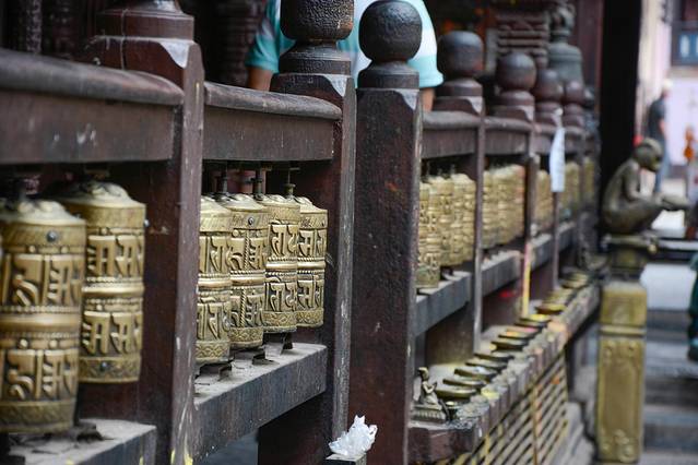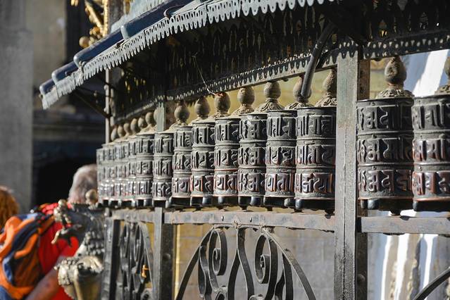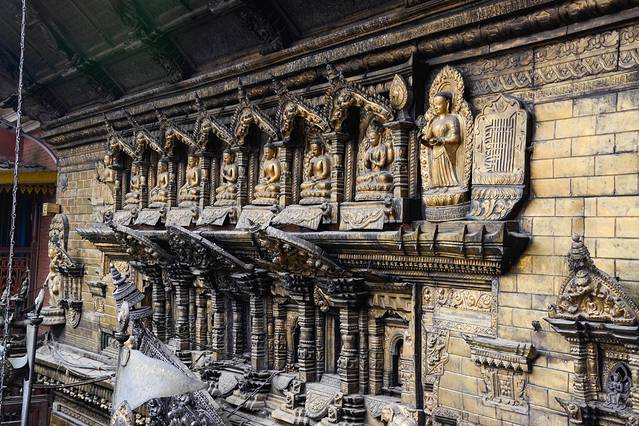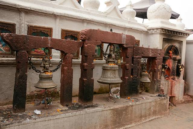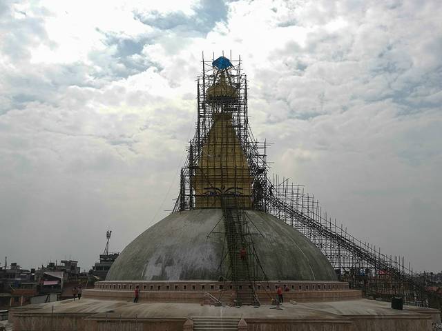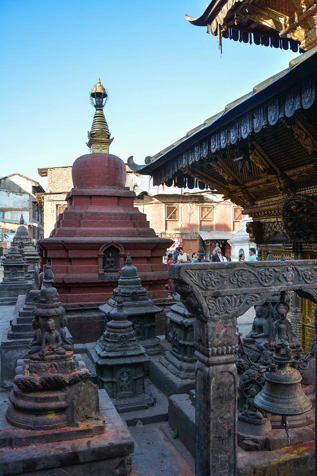2015年的地震只对主塔造成轻微损伤,并没有像博德纳损坏的那样严重,但副塔倒塌了。傍晚时分十来猴庙的最佳时间,镀金的佛眼在夕阳的光辉下闪闪发光,古老的雕刻占据着这里的每一寸空间,空气中飘荡着燃香和酥油灯的气味,观景台上俯瞰夕阳下的加德满都全境,那楼与楼之间的密度丝毫不逊色于上海老城,沿着顺时针轻轻拨动转经筒,将自己的心声传递给佛祖。