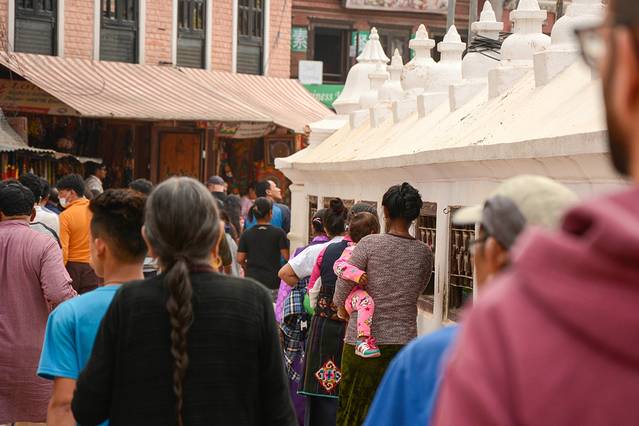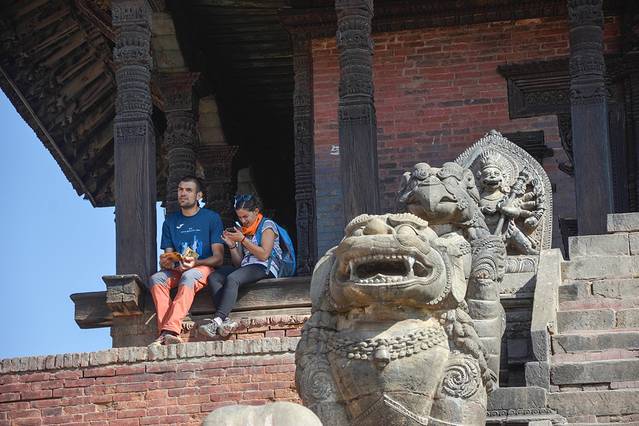 谷内最后一座杜巴广场,果然首都的杜巴广场就是不一样,这里真是人声鼎沸,人头攒动,各种寺庙神殿旁都坐满了人,嘈杂的声音此起彼伏,也不知道是因为来得太晚还是人太多管不过来,这里竟没有人要我们买票。