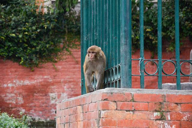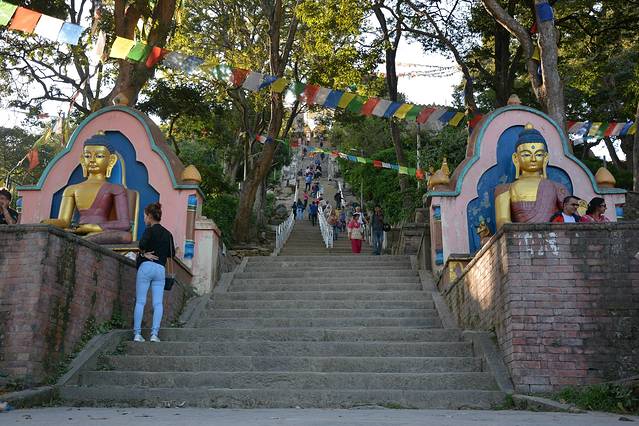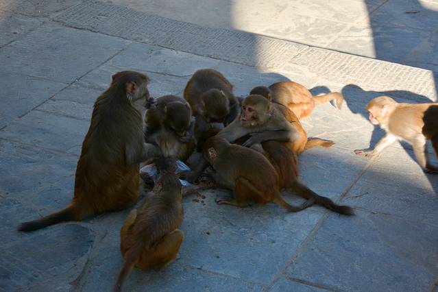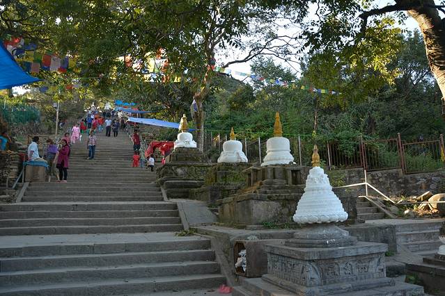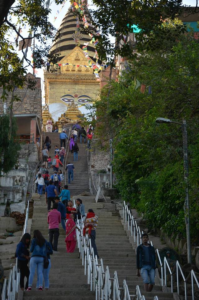 猴庙,准确的叫法应该是斯瓦扬布纳寺(Swayambhunath),位于加德满都的西面一座山顶,门票200Rs。我们从泰米尔打车到东面的山脚300Rs,然后沿着石梯一路向上,这边的猴子要比烧尸庙的猴子还要多,好在这里的猴子也不会主动打劫你。