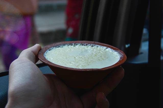 这巴克塔普尔的酸奶举世无双,但要说哪里最好吃,路书给出了推荐,这家简陋餐馆位于杜巴广场和公共汽车站之间,出了古城大门就能看到,“酸奶之王”都装在陶碗中,每碗50Rs。