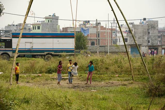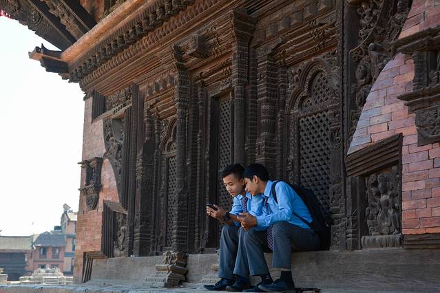 将近中午时分,尼泊尔的学生已经放学,悠闲地坐在台阶上玩着手机,这里的学生似乎没有那么大的学习压力。