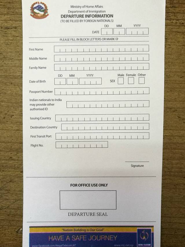 再来说一下离开尼泊尔吧,首先说一下一旦进了机场办理了登机牌之后就不能再走出机场了,索要想再离开之前在机场外留影的要趁早啊。回归正题,机场的一楼是各大航空公司的办理柜台,然后办好了才可以上二楼,刚一上到二楼在左手边就是离境需要填的表格,相对入境时填的,这回的要简单很多,填好后也是拿着这张表格和护照就可以到离境柜台办理出境了,也算是走出了尼泊尔的大门,之后过安检等着登机就好了。