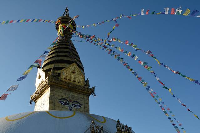 猴庙佛塔与博德纳大佛塔建筑相似,只是规模相对要小,因在去年的地震这里受损不严重,所以可以看到佛塔本来的样貌,洁白的塔身,金色的塔尖和顺风飘扬的五色经幡
