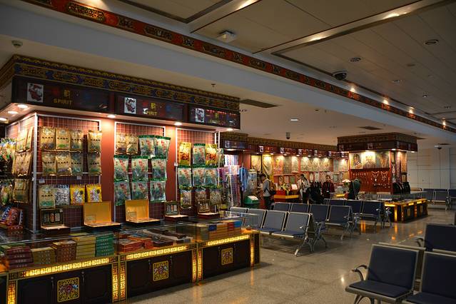 候机大厅不是很大,里面只有一家小超市,还有一些售卖西藏特色的商铺。