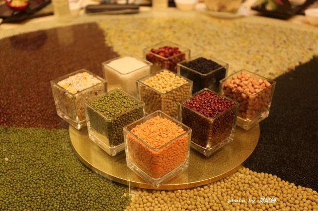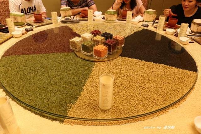 用五色豆做成的转盘,中间摆的是九宫格豆,很有养生与易经的文化