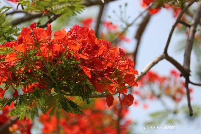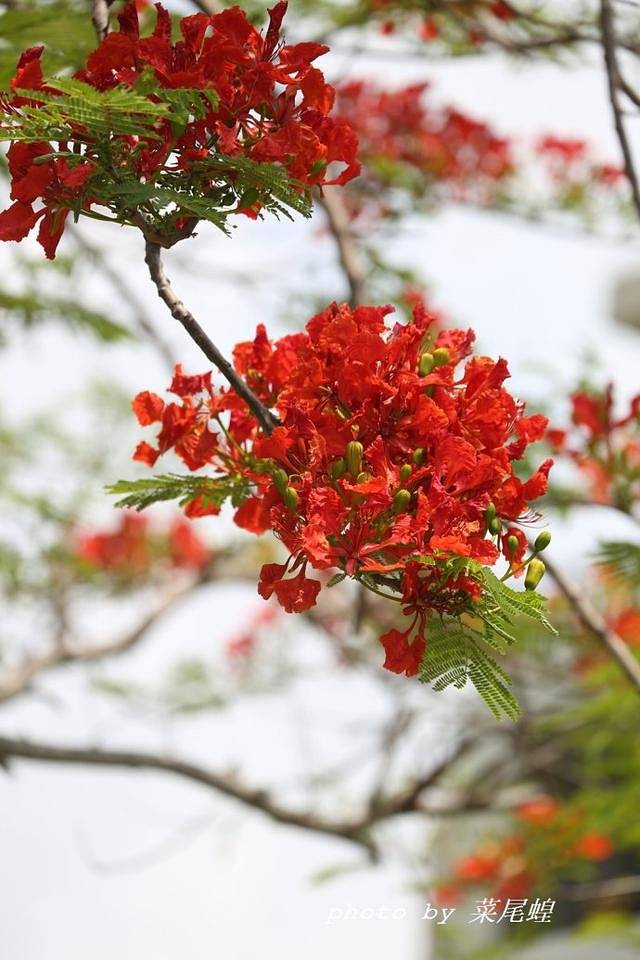 那时认识凤凰花是在柬埔寨,火红绽放在暹粒小吴哥的老凤凰树上,鲜艳如火,迎着骄阳,璀璨绽放,这次没想到在园林里遇见,还是那么骄艳,如火绽放,如同生命里的色彩,熟悉而激奋人心。