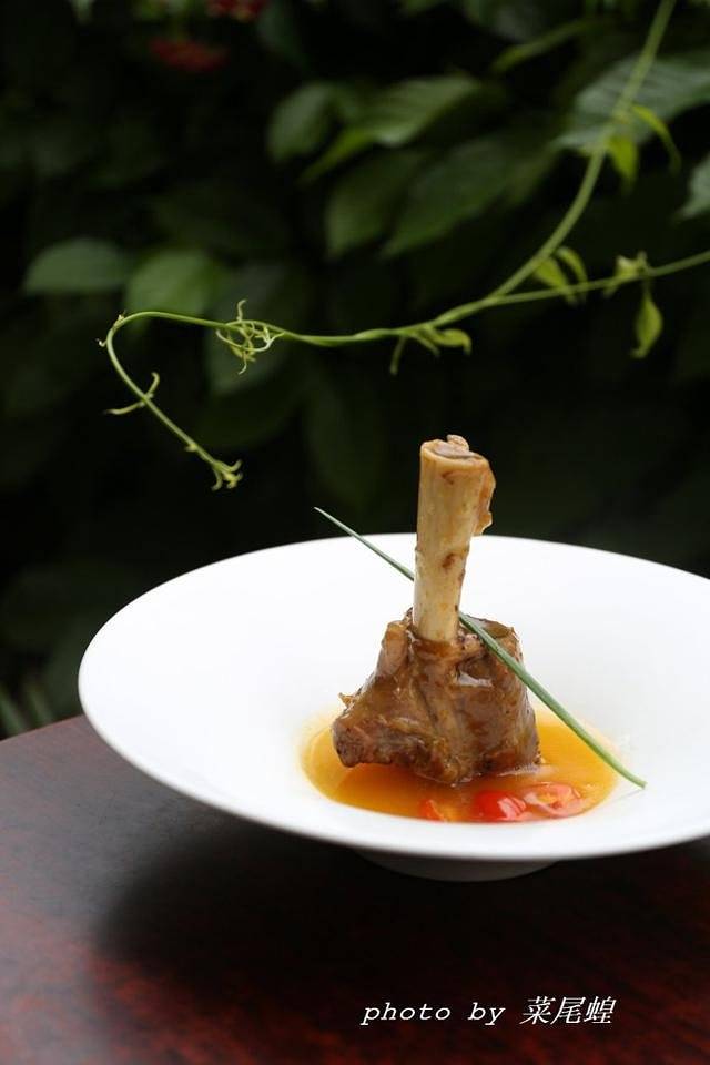 “柱汁扒羊腱”瑶柱,作为舌尖的恩物,不入燕鲍翅的俗套,默默的为一切美食点缀,牺牲自我得以把色如紫檀的羊腱喂养得娇嫩,赶跑了微骚,沉淀了馥郁芬芳醇厚。