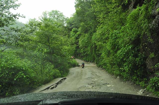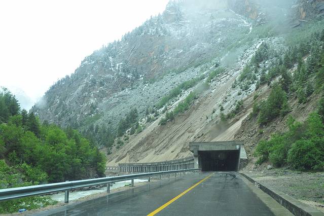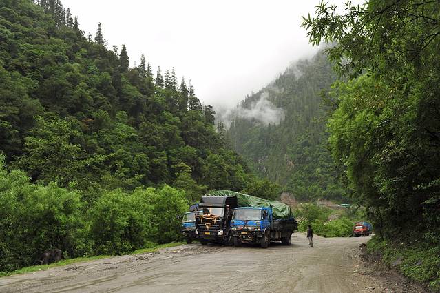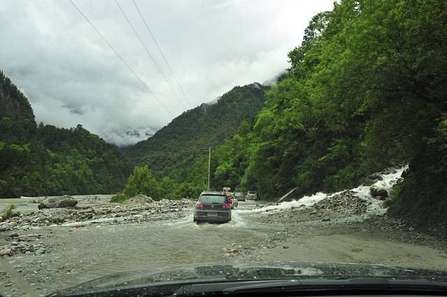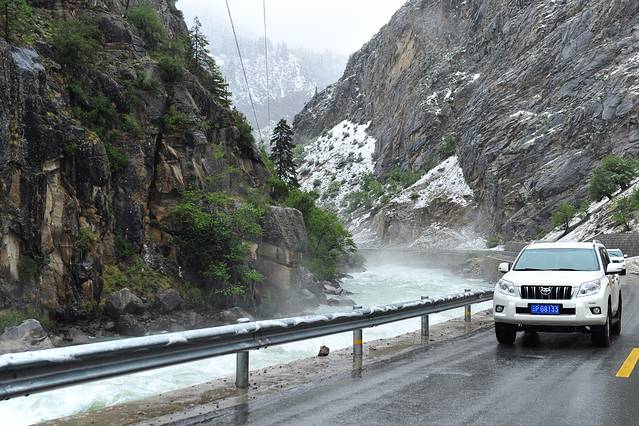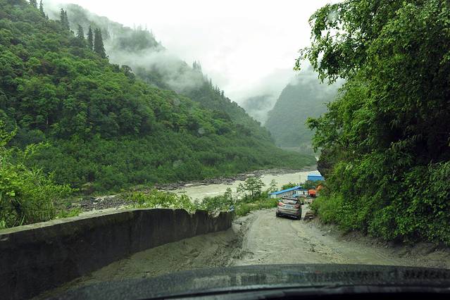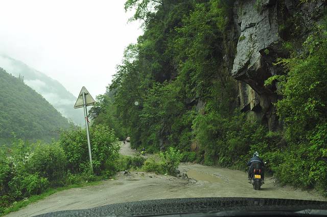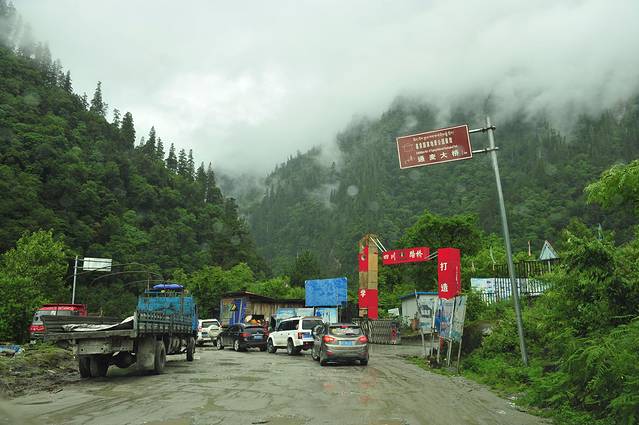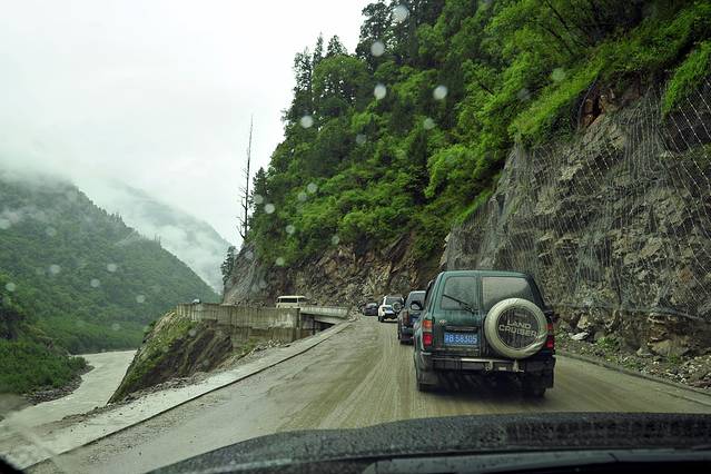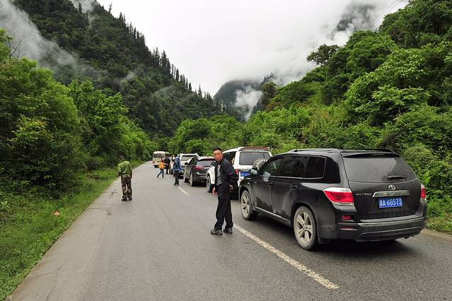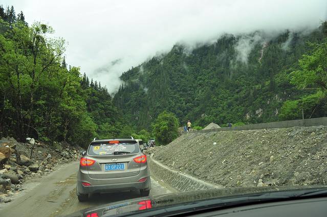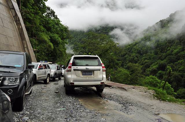6月13日由波密前往八一。早上在早餐店吃早餐时,依然小雨绵绵,老板听说我们去拉萨,就说今天肯定走不了,连续阴雨,塌方不断,他的店伙计昨天回波密,在通麦路段被塌方的石头砸中车后轮,车子不能开了,人没有事,叫的救援车已经在回波密的路上了,清理塌方的救援车昨天晚上就在工作了,估计最快也要下午才能通行。我们吃完饭,就试着出发了,先去加油,波密的油价竟然比墨脱还贵2块钱。