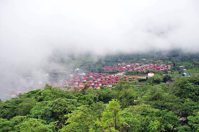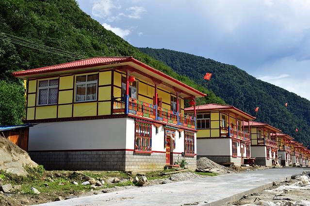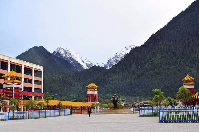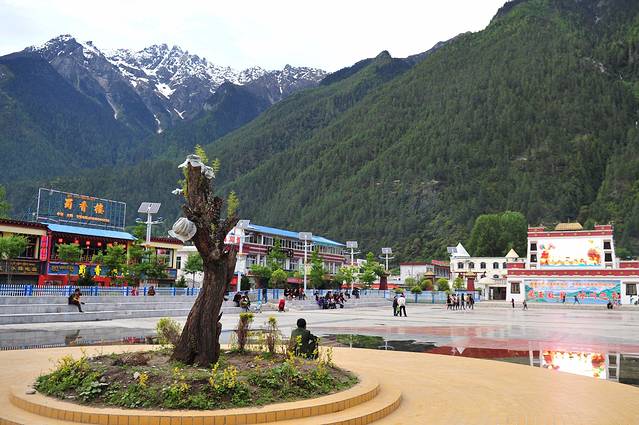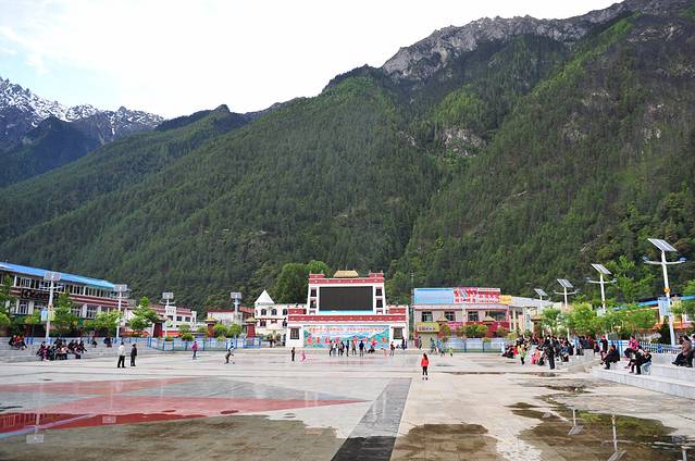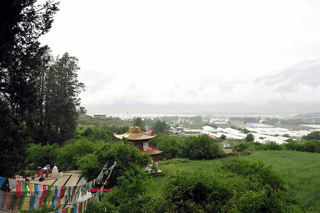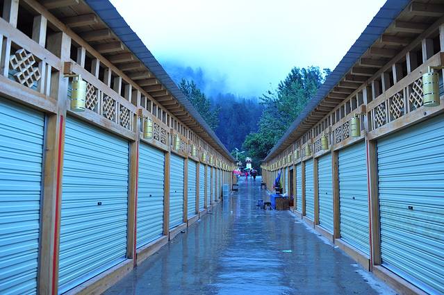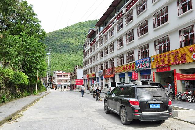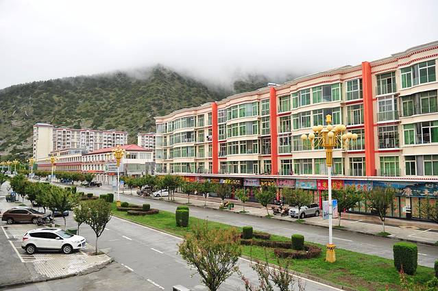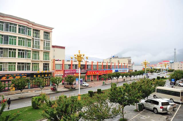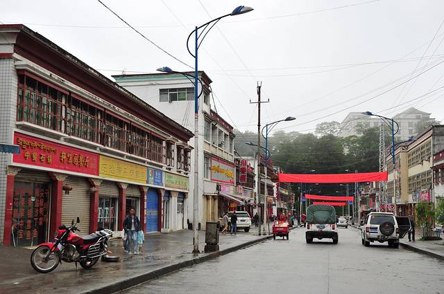 6月14日,先在林芝城区转了一圈,又去巨柏林景区,天又下起了不大不小的雨。巨柏林景区前的商业街铺。