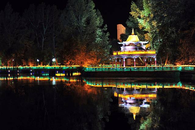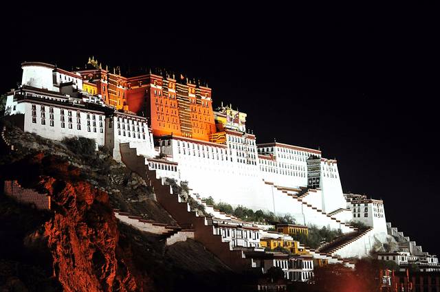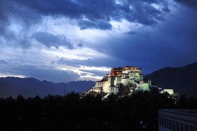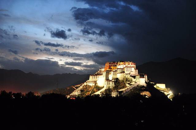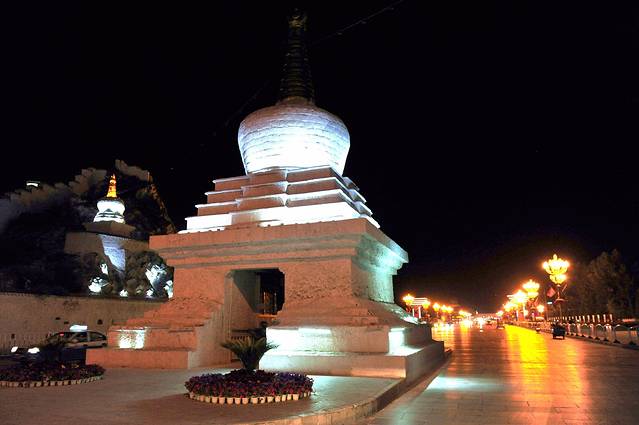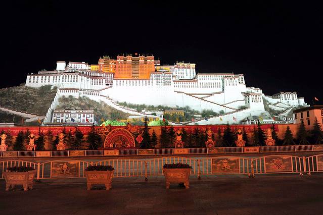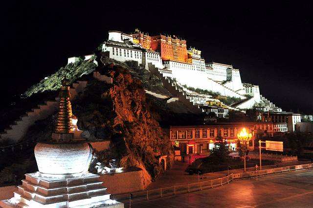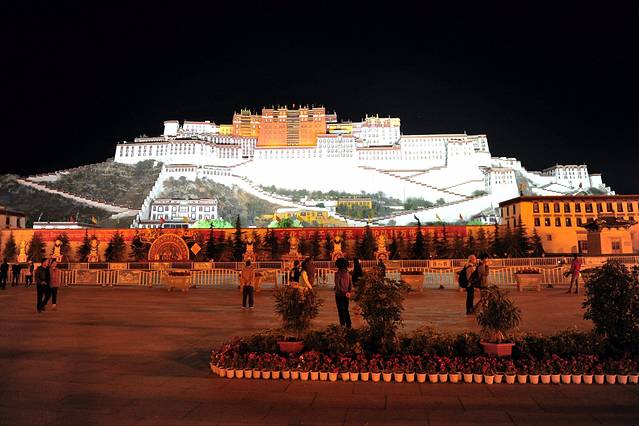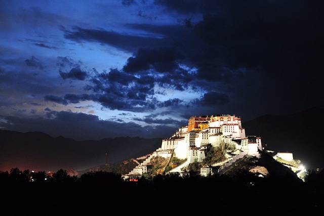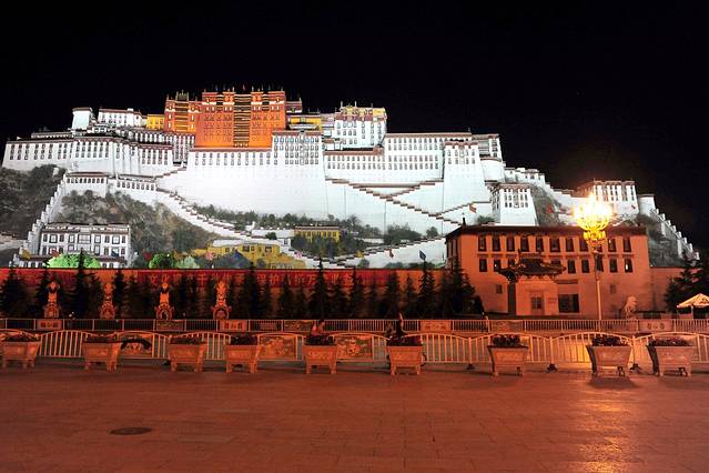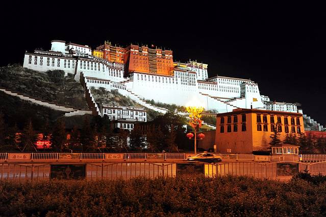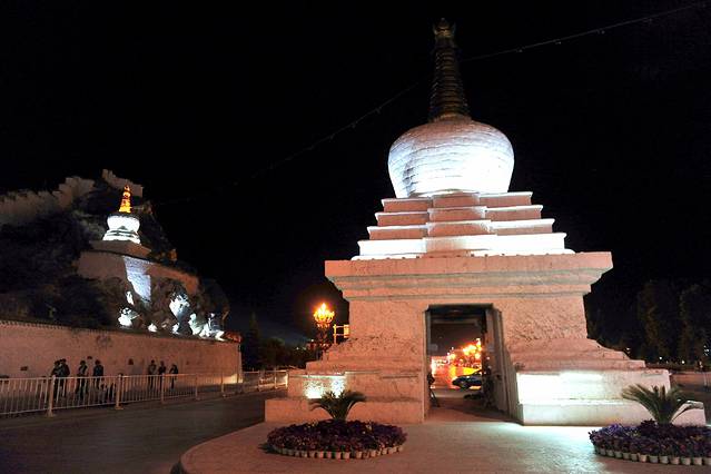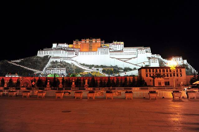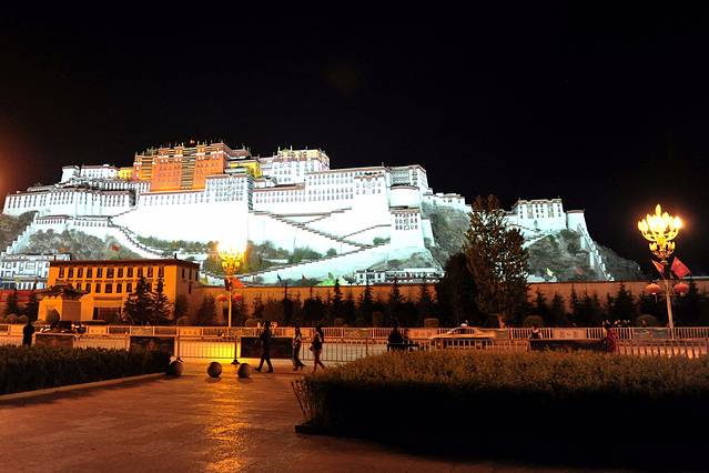 酒足饭饱,照片也拍好了,再次来到北京路和布达拉宫,由东向西沿北京路广场一侧边走边拍布达拉宫夜景。
