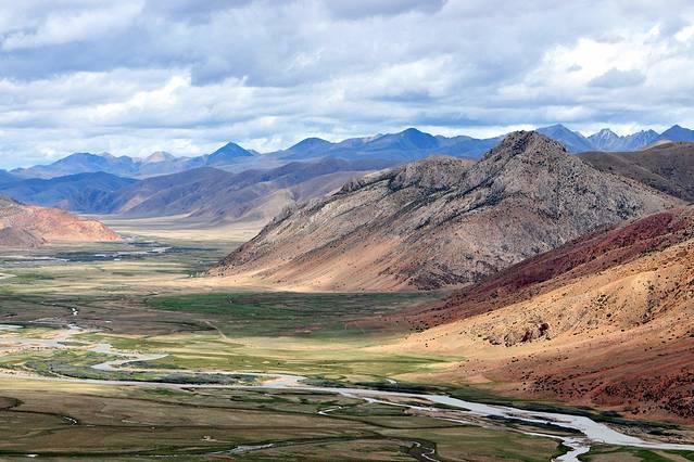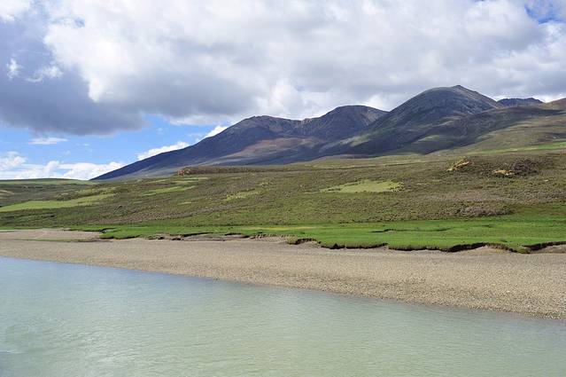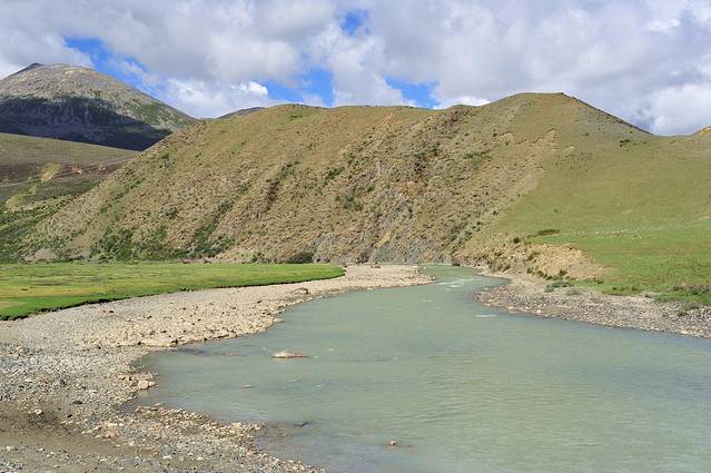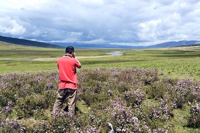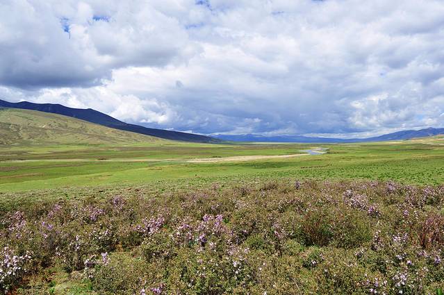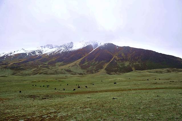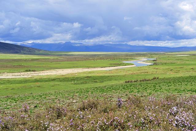 一直延伸至海子山脚。但此时草原刚刚返绿,离7月草原的最美黄金季节尚有一段时间,花草不多。发源于海子山的无量河从草原中部穿过,十数条大小支流在草原上流趟、注入干流,河两岸分布着无数草原沼泽湿地。