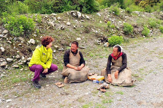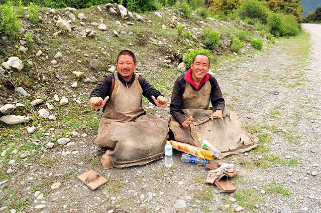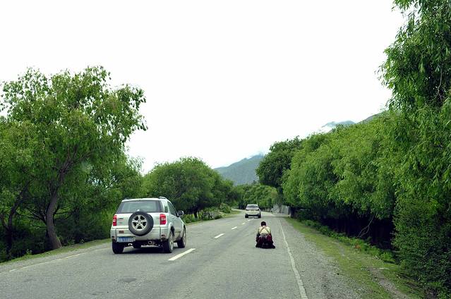 又遇到两个磕长头在路边休息的藏民,我们停车时,他们示意向我们求助,需要吃的和水,我们赶紧把一大袋面包和几瓶水给他们。