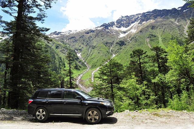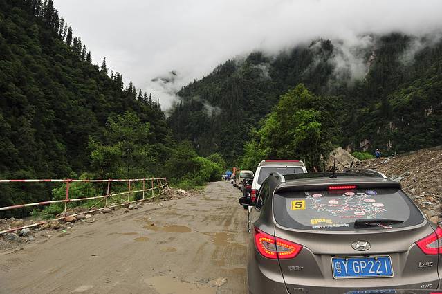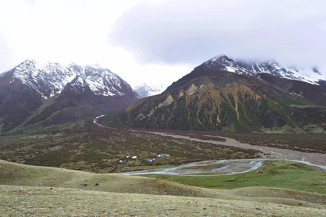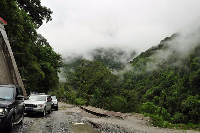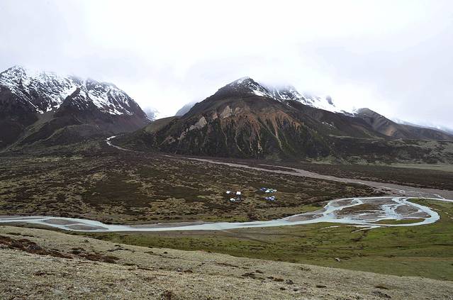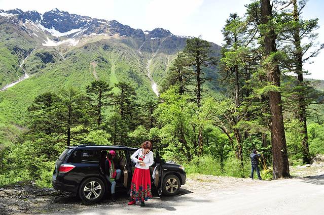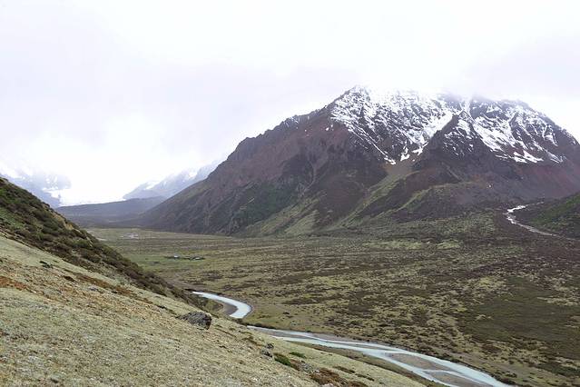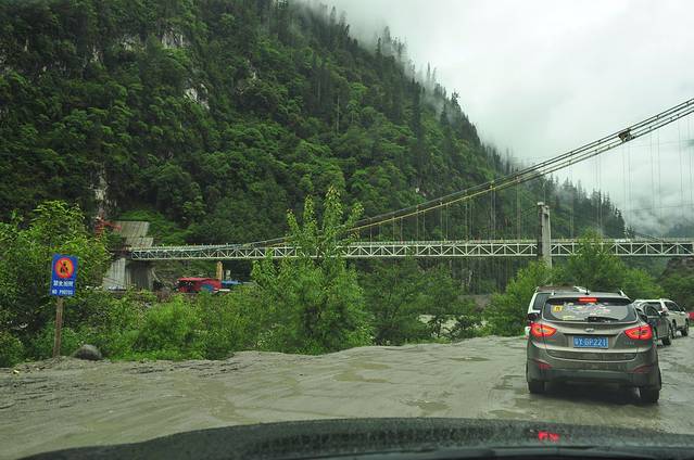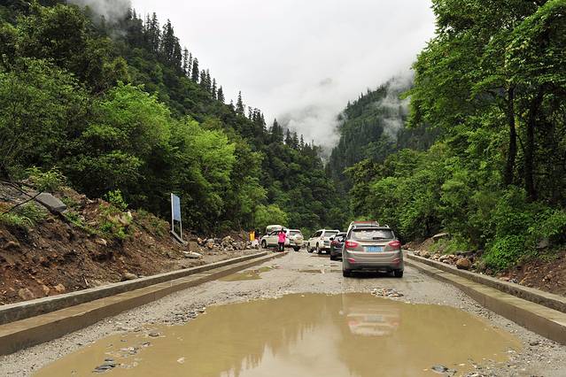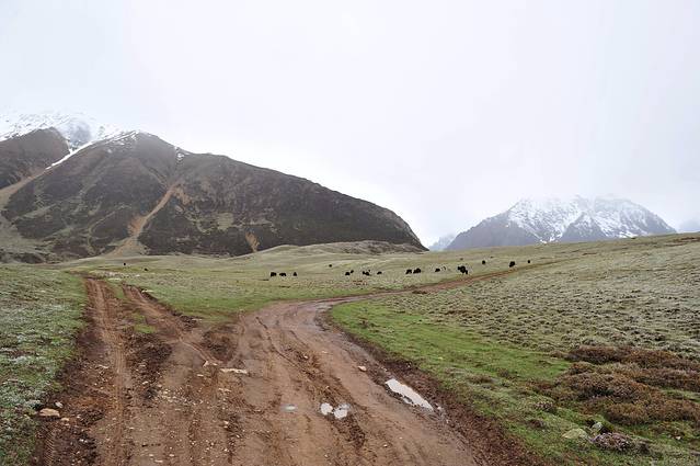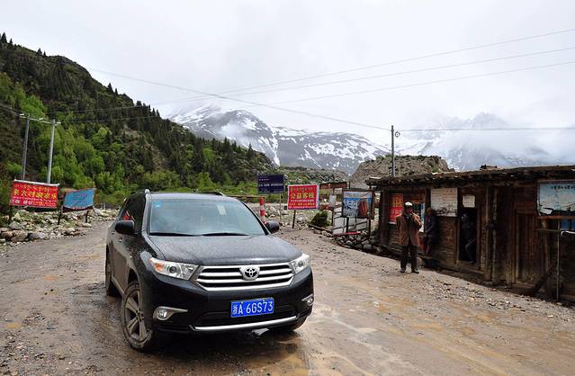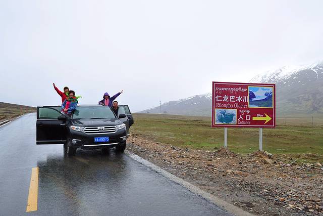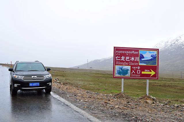 仁龙巴冰川离开主路还有5公里,开进去,过了一条河,因下雨道路过于泥泞,前方路况也不明,决定把车停在这里,步行前往。