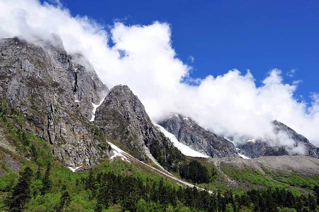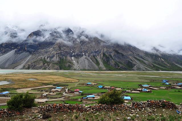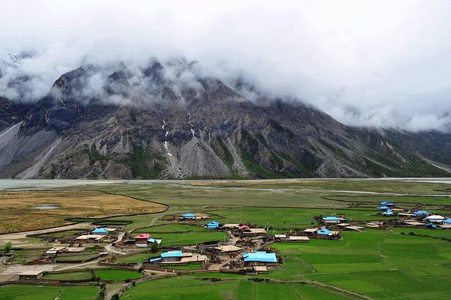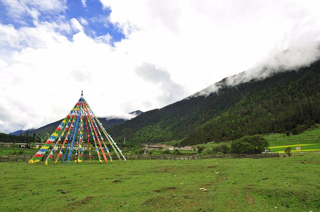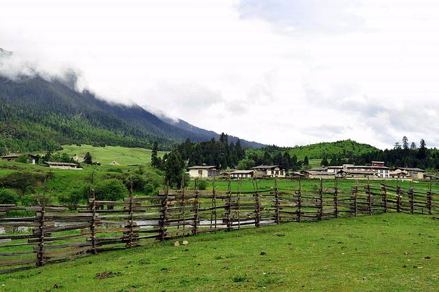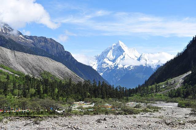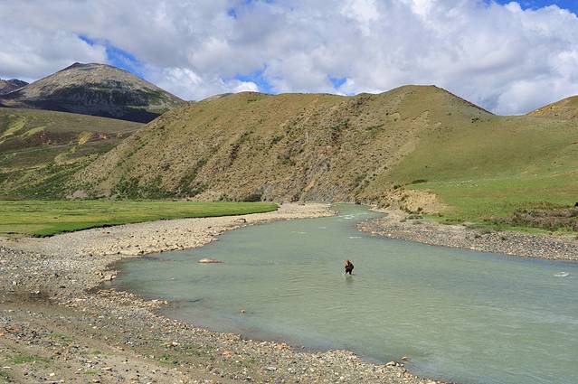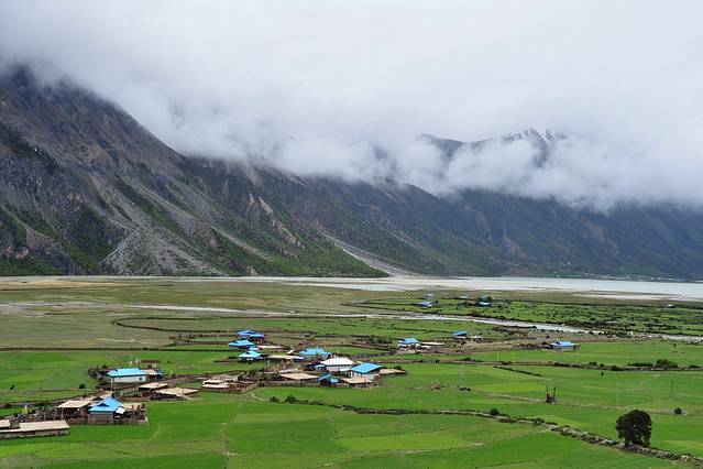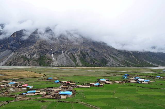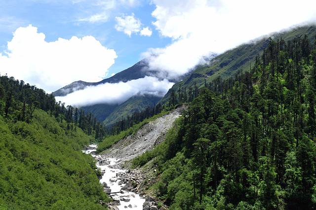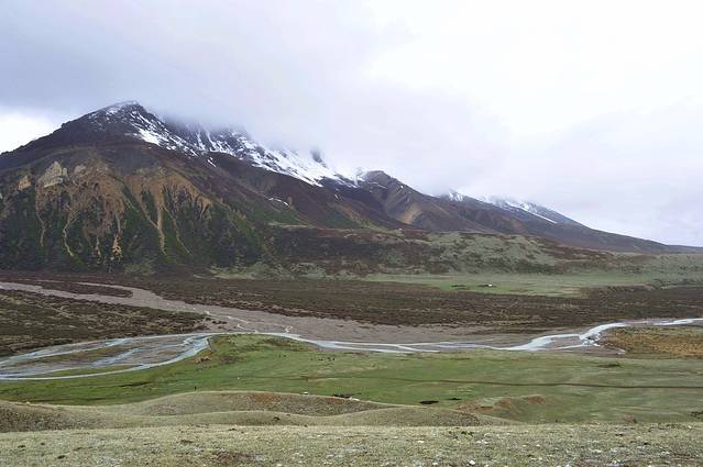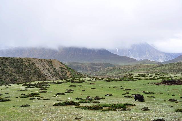 仁龙巴冰川离开主路还有5公里,开进去,过了一条河,因下雨道路过于泥泞,前方路况也不明,决定把车停在这里,步行前往。