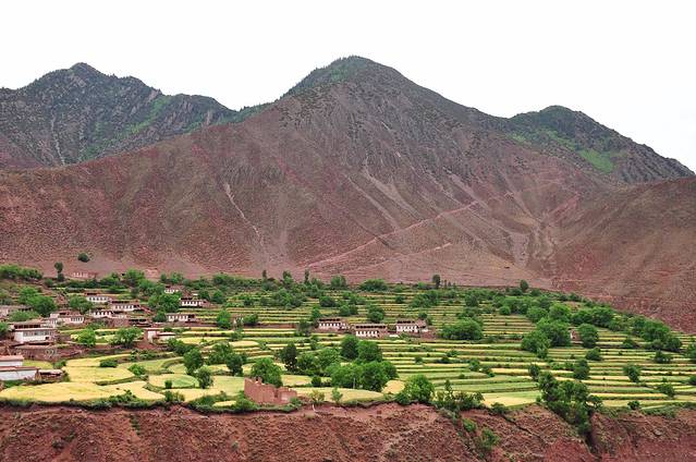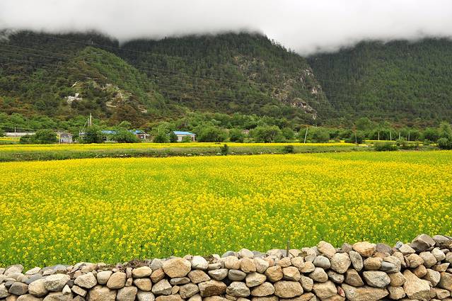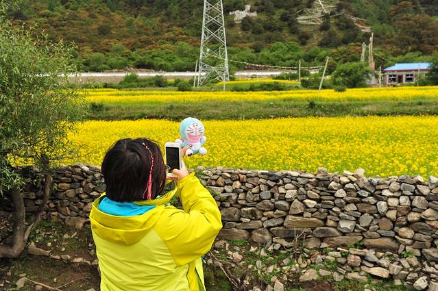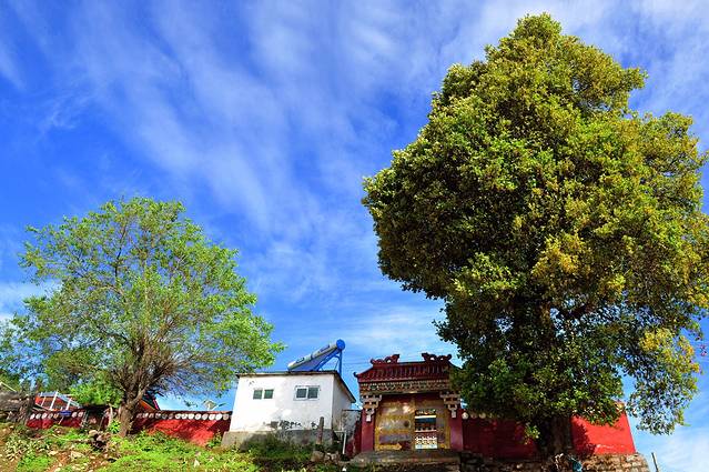 下山后不久,看到路边左侧山坡上有一座被油菜花包围的美丽村庄,逐向右拐向一条小路上山,想站在更高处拍摄。到了山顶还看到一座不知名的寺庙。拍完照片返回G318,才知道这个美丽的小村庄叫如美村。
