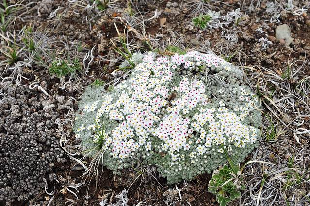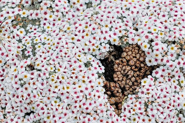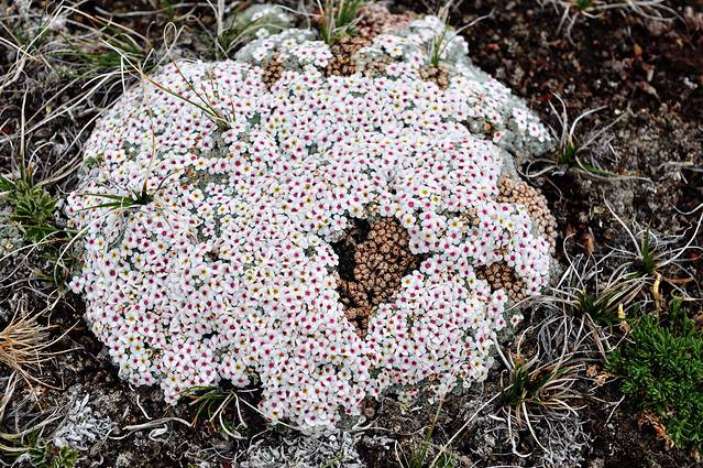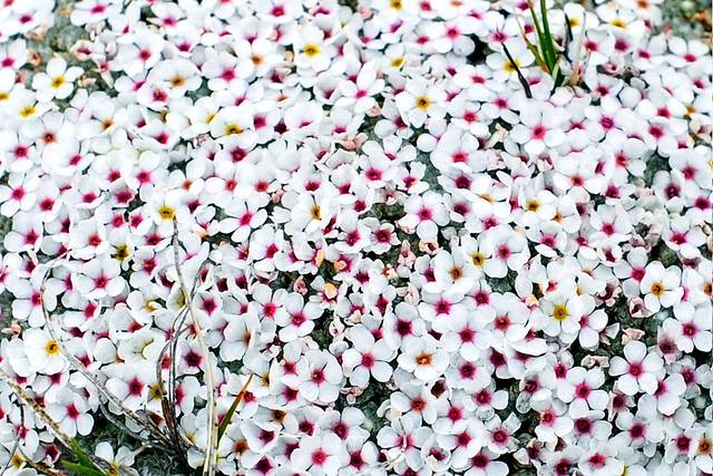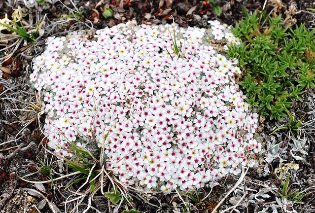 地面草丛里的高原苔类植物盛开着密密麻麻漂亮花朵