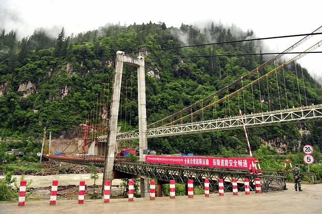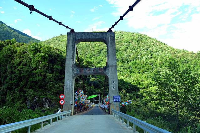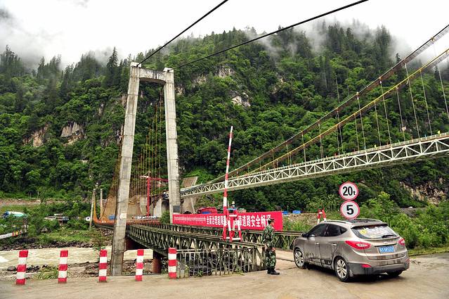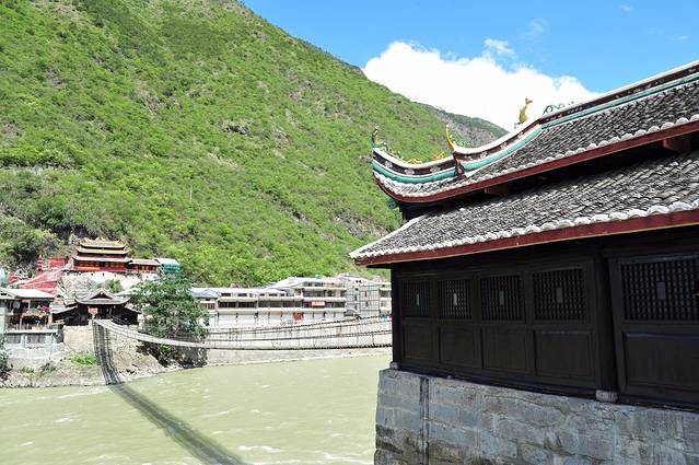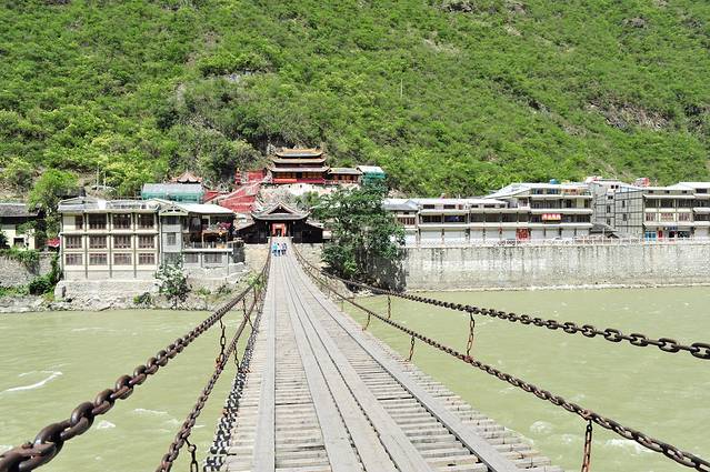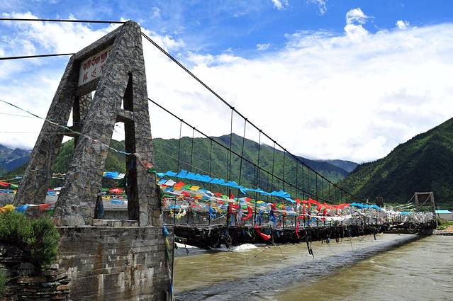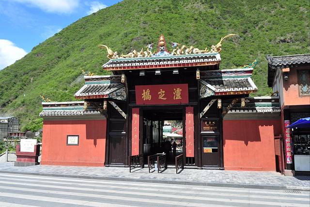 来到泸定桥。泸定桥又称铁索桥,是中国古代桥梁建筑的杰作。相传康熙统一中国后,为加强川藏地区经济文化交流而御批修建此桥。泸定桥两岸的桥头古堡为汉族木结构古建筑,为中国独有。该桥始建于清康熙44年(1705年),建成于康熙45年(1706年)。康熙御笔题写"泸定桥",并立御碑于桥头,桥长103米,宽3米,13根铁链固定在两岸桥台落井里,9根作底链,4根分两侧作扶手,共有12164个铁环相扣,全桥铁件重40余吨。自清以来,此桥为四川入藏的重要通道和军事要津。1935年5月29日,中国工农红军长征途经这里,以22位勇士为先导的突击队,冒着敌人的枪林弹雨,在铁索桥上匍匐前进,一举消灭桥头守卫。被后人记载为“飞夺泸定桥”,使之成为中国共产党重要的历史纪念地。