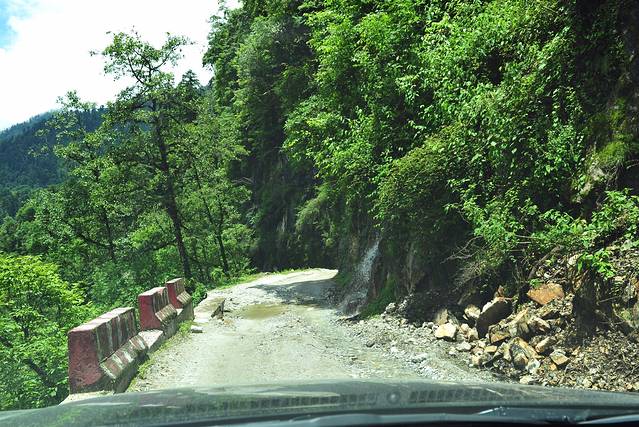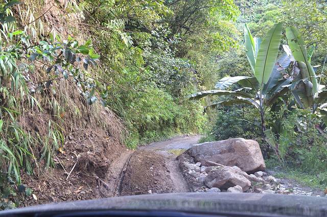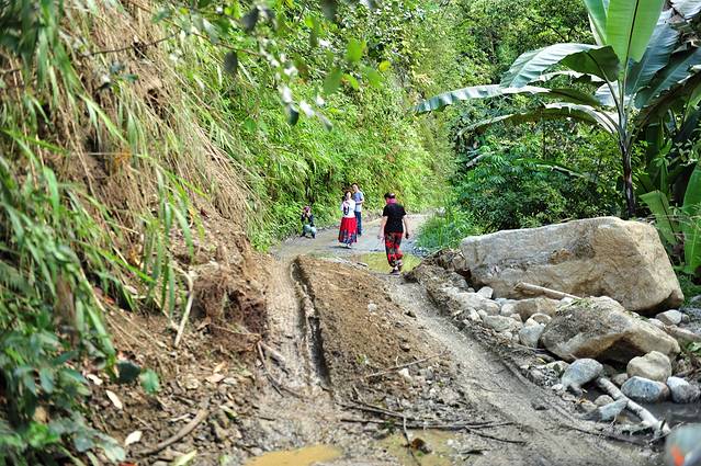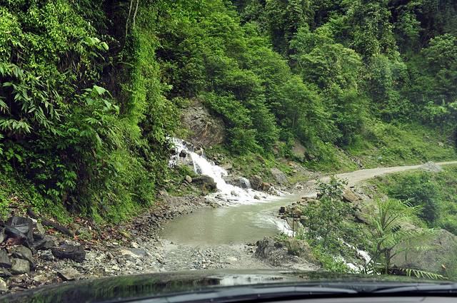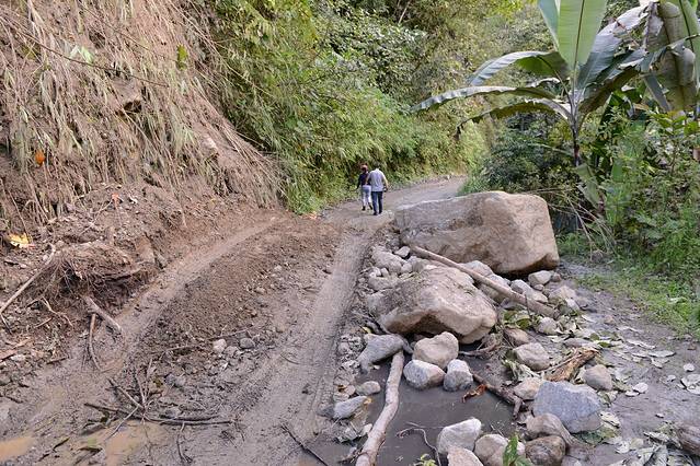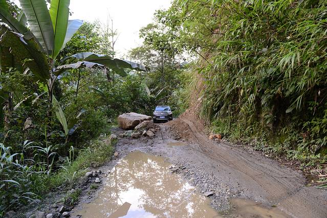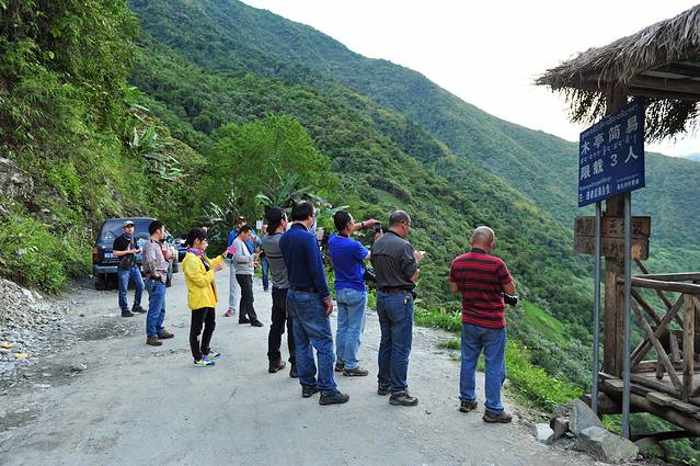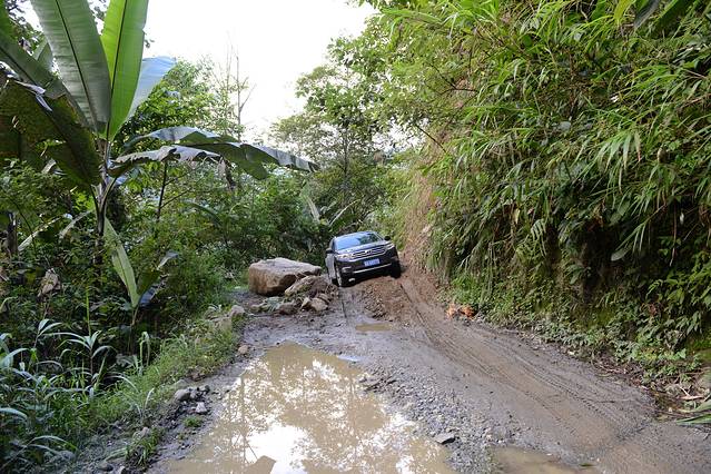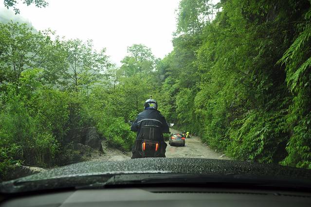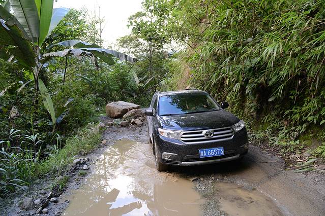 过桥后继续前行,询问对向开过来的一辆三菱越野车前面还有多远到大拐弯,三辆车司机说不远了,但有一处塌方,底盘不高的车、不是四驱车不可能过去,他的四驱三菱车,很艰难很危险地才过去过来,劝我们返回,说已经有几辆车停在塌方前面,徒步去大拐弯了。谢过提醒,我继续往前开,这就是我的个性,多年来的自驾行摄经历和经验,使得我总结出,不会听取无论是网上或路遇的任何人的意见和建议,因为每个人对各种凡是有度的概念的事物感觉、感受、评判、判断和处理能力是完全不一样的,他们的判断与能力不代表我的判断与能力。即使确实过不去,我也必须亲眼所见,进到主观上最大的努力,而绝不人云亦云地轻易放弃。来到离塌方不远处,果然看到有车子停在路边,我直接把车子开到塌方处停下,下车查看,用脚踩了踩高处的沙石,此时刚才在桥上遇见的福建车队也返到这里了,问我可不可以过去,我有点轻视地笑了笑,什么话也没有说,直接上车开车,稍有托底擦过轻轻松松就过去了,我心想就是让我开普通轿车我也能过去。过了塌方处不远,就到了果果糖大拐弯。