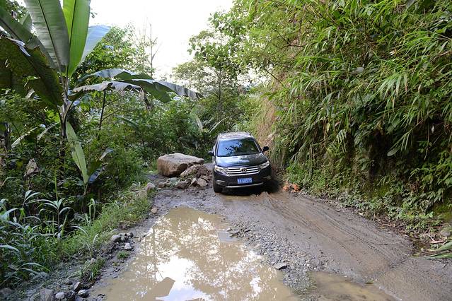 临近棑龙险滩,一辆当地的丰田陆巡连续鸣笛超我的车,快速超过我后,由于动静比较大,右侧山体有大石头滚落,我冷静刹车避让,离石头几米远停下,前后左右观察后继续前行,过排龙险滩时,没有看到和遇到什么险情。