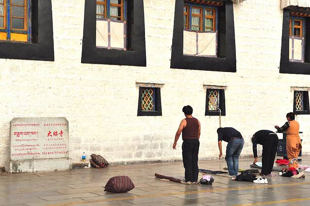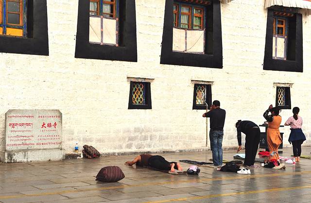 交谈得知,他们来自巴塘,已经磕长头走了半年多,到拉萨还要磕长头走约一年多。