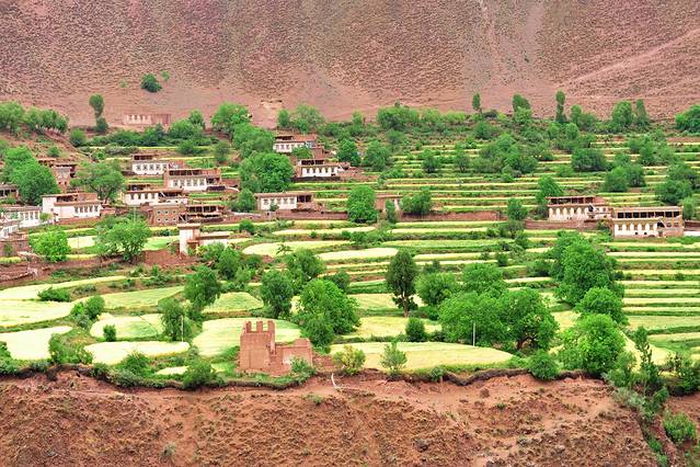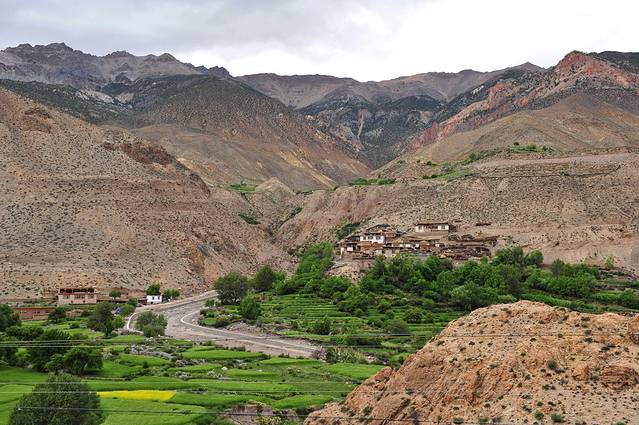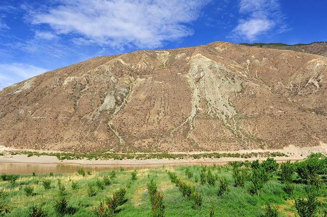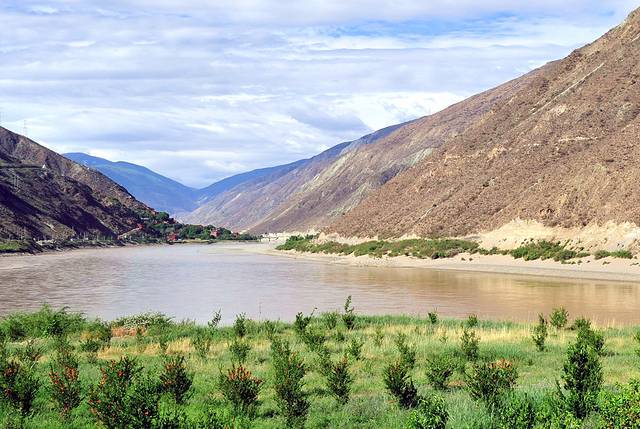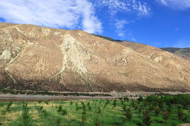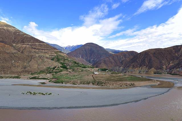 公路对面雅鲁藏布江岸边山坡上的漂亮村庄