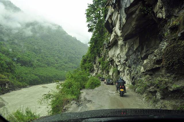 开始翻越觉凹山口,公路左手边便是深达几百米的雅鲁藏布江。前面的盘山公路直通云端。开始下雨。