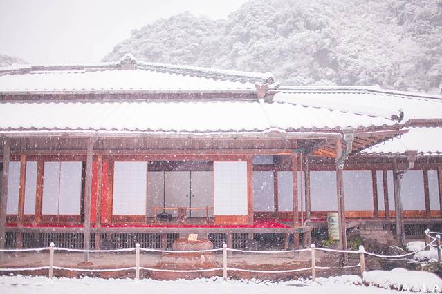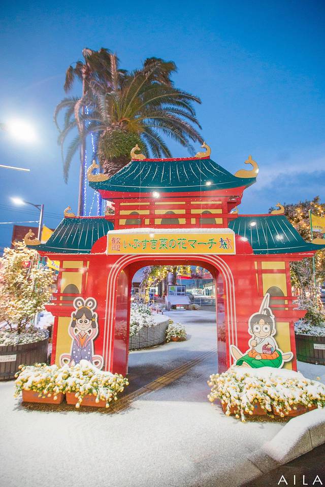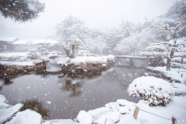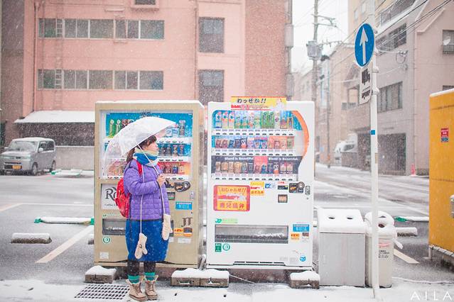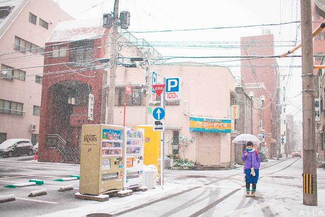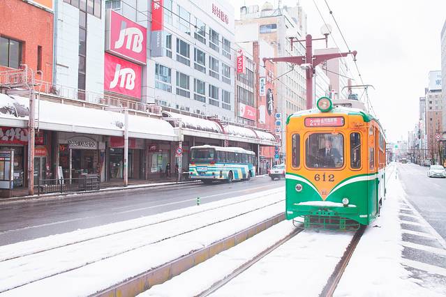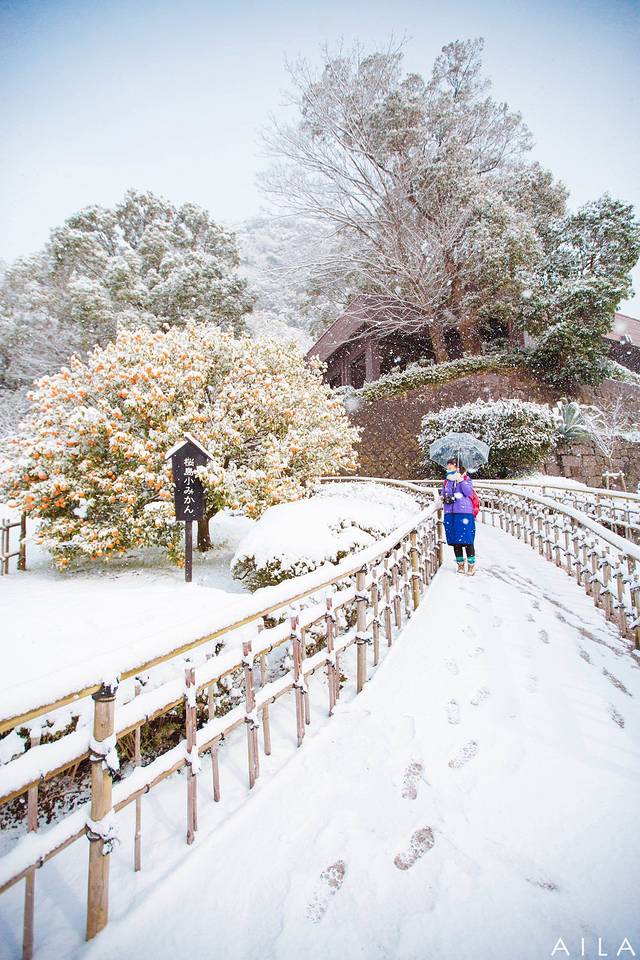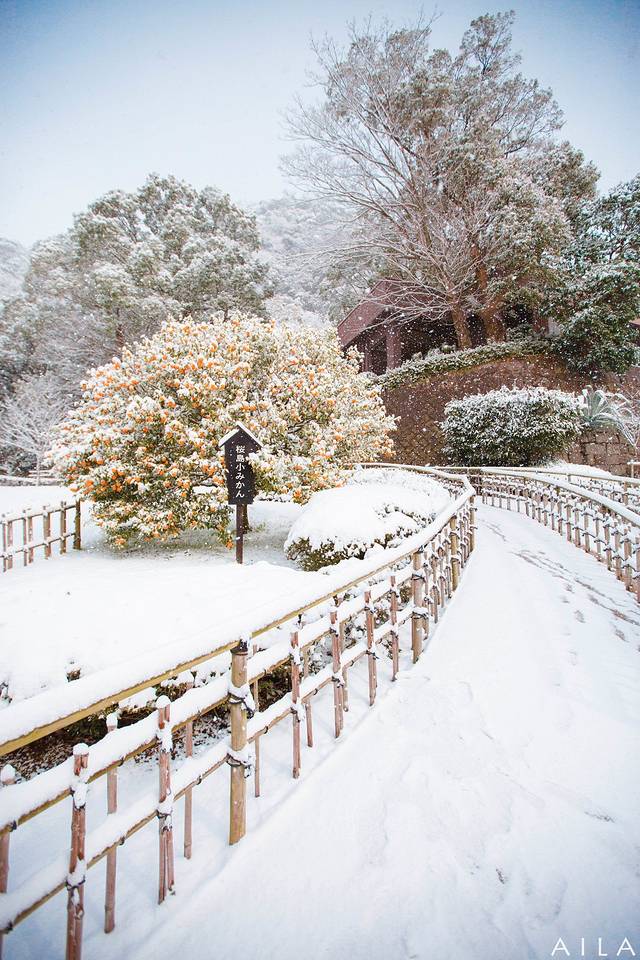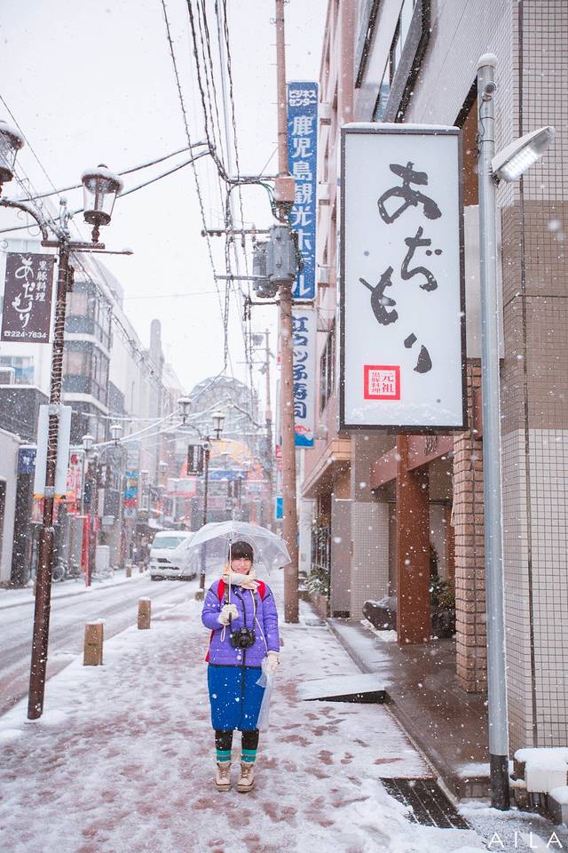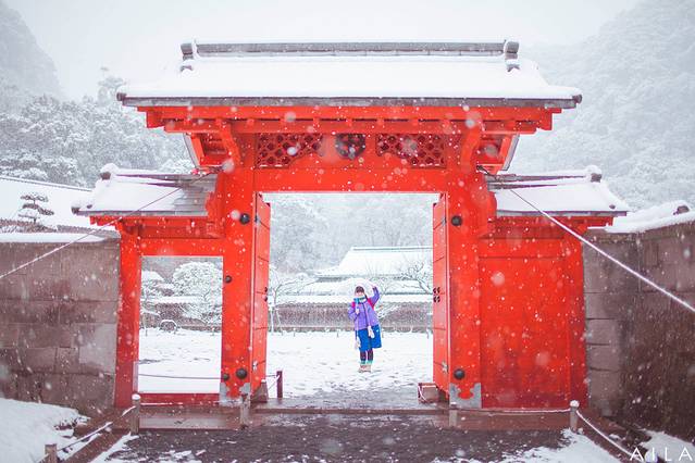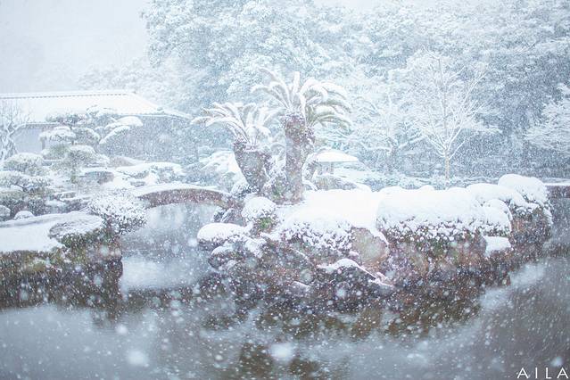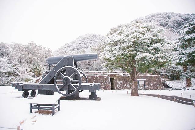 一边玩一边往天文馆商业街走,雪越下越大。穿过几条小街道,来到卖鹿儿岛观光通票的地方计划买两张鹿儿岛景区的观光车通票。没想到被告知,因下雪的原因,城山展望台关闭了。啊!那多没劲啊,算了,考虑了一下决定还是打车吧。于是路边打车去仙岩园。这里的突发天气应急措施有条不紊,一早上下的雪,路面上的车很快就都给轮胎安装好了防滑链。