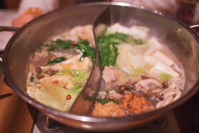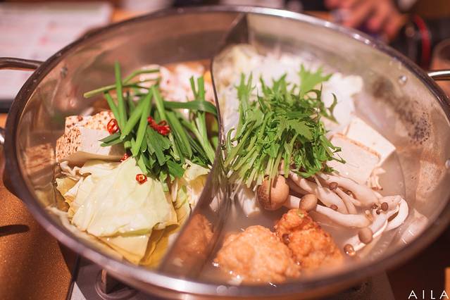 真正的吃主来了,点了一个这里的特色双色锅,所谓双色锅就是一半水炊锅一半牛杂锅。自从上一次吃过牛杂锅以后,爱拉至今念念不忘。所以特意来点的双色锅呢。水炊锅也是博多的特色美食呢,就是在熬制的鸡骨汤里加入好吃的新鲜鸡肉、白菜、胡萝卜、菇类等蔬菜。锅开了以后先喝鸡汤,然后取出鸡肉蘸橙醋吃,最后煮成杂炊就是水炊锅最地道的吃法。