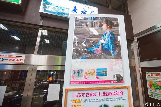 车站的广告牌子上一个身着日式和服的姑娘正在享受沙蒸温泉,和我想象的画面完全吻合。