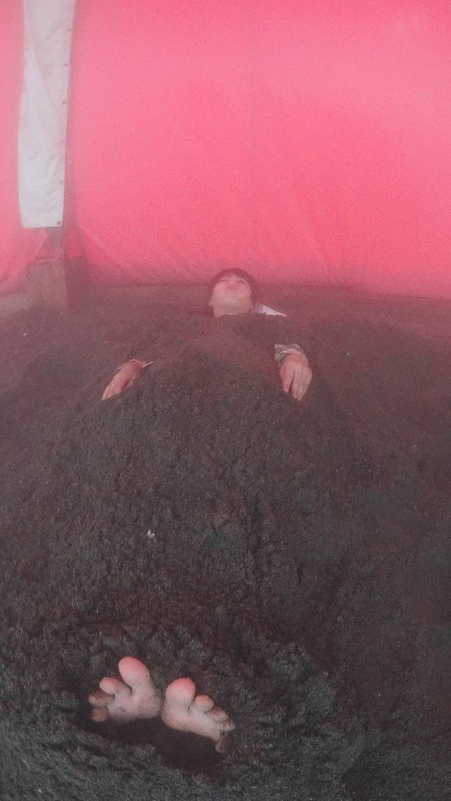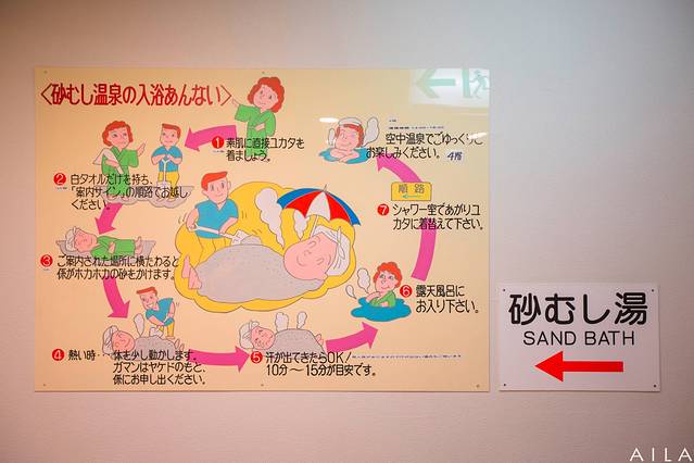 这个示意图清楚地表明了沙蒸的全过程,第一步:换衣服 第二步:带着一块小白毛巾去海边;第三步:躺在温暖的沙滩上晒着太阳等待工作人员;第四步:被热腾腾的沙子埋起;第五步:来享受15分钟,第六步:去露天温泉享受;第七步:去楼顶的空中温泉享受。好了不用想我们必须华丽丽的错过了第六步,外面天寒地冻,傻瓜才有勇气去露天泡。