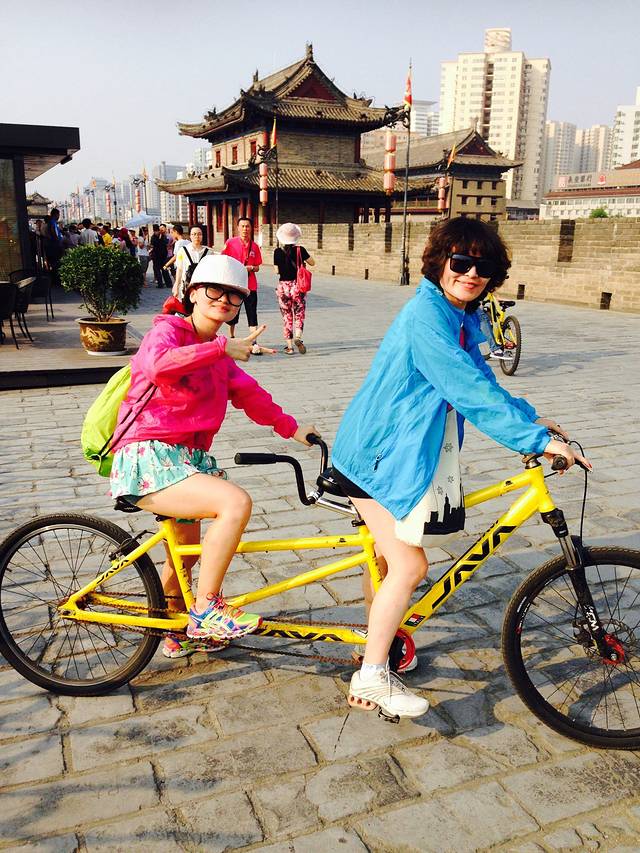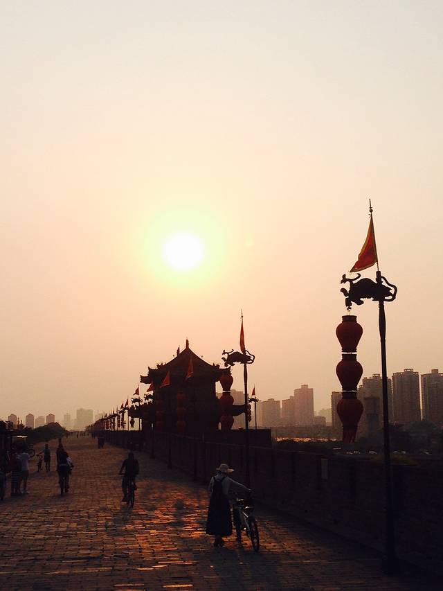 在网上买了古城墙的票,加双人自行车,两个人一百五十左右吧,三点半多集合一起上东门,还有导游解说。下午四点上城墙是我看到网上集合时间最晚的了,结果还是被晒成狗。。。自行车可以骑两个小时,差不多五点拿到的正好可以骑到七点钟城墙关门,路上很颠簸,骑自行车屁股很疼,本来鸿鹄之志想从东门骑过南门、西门再到北门直接下来就是酒店了,随意的方向感导致走了另一边,直接从东门骑到了北门,已经一个小时过去了。。。好吧,就这样吧,反正也饿了,夕阳来的实在太迟了,晒的不要不要的,更不要说看夜景之类的
