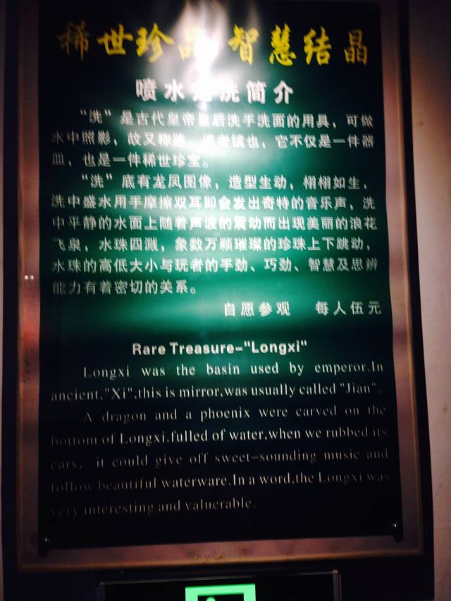 还有个很神秘的地方是要交5块钱看龙洗,被带进了一个很破旧的小屋子里,有一个古老的龙洗,是皇帝洗脸的脸盆,可以发出四个不同的音,妙在摩擦两边扶手上可以发生共振,水会喷泉一般的弹出来,还可以看到天圆地方的形状,真是佩服古人的智慧,搁在现代我都造不出这么个神器来。还有个仿造的脸盆可以自己尝试,可惜资质愚钝摩擦了好久都木有出现喷泉出来。。。