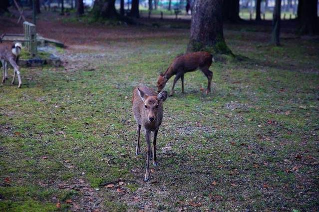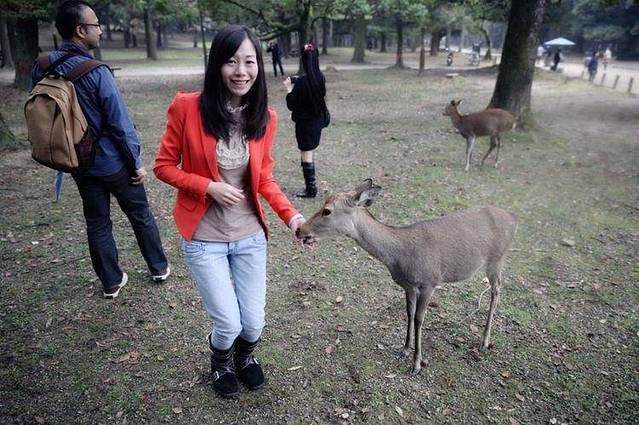 途径奈良公园,听说里面有2000多只鹿,游客们可以买食物喂它们,经过驯化的小鹿都很温顺。