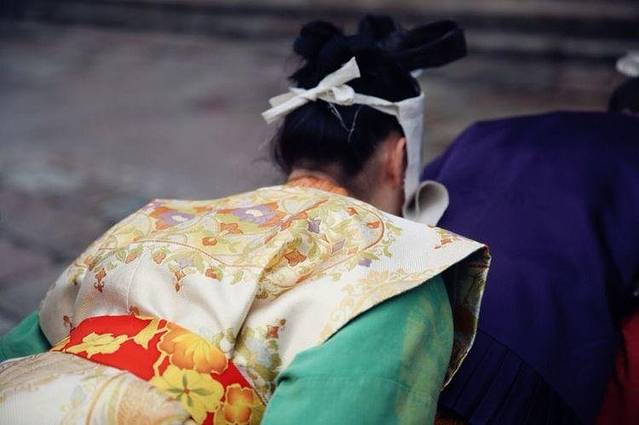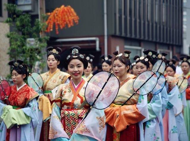长长的队伍中,所有的仕女都统一是唐朝的宫廷装扮。