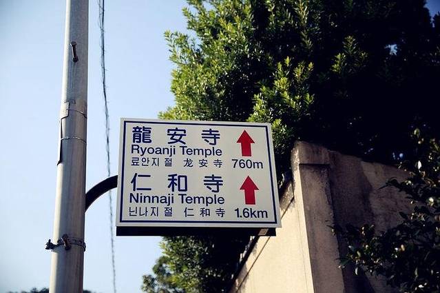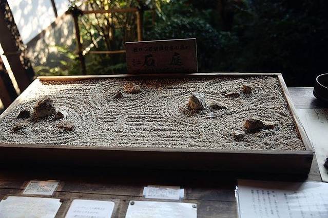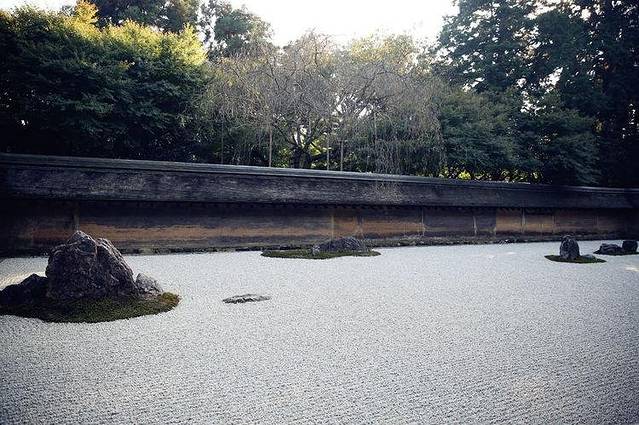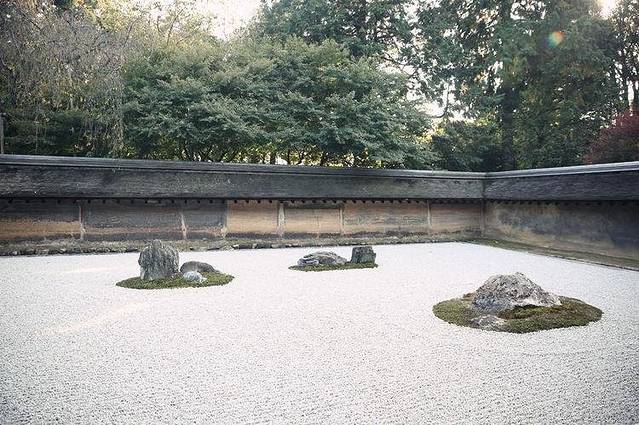 在东西走向的长方形庭院里,铺着白沙,配着15块大小不一的石头,石头放置怪异,不管是从任何角度观赏,都有一块石头隐身不见。
