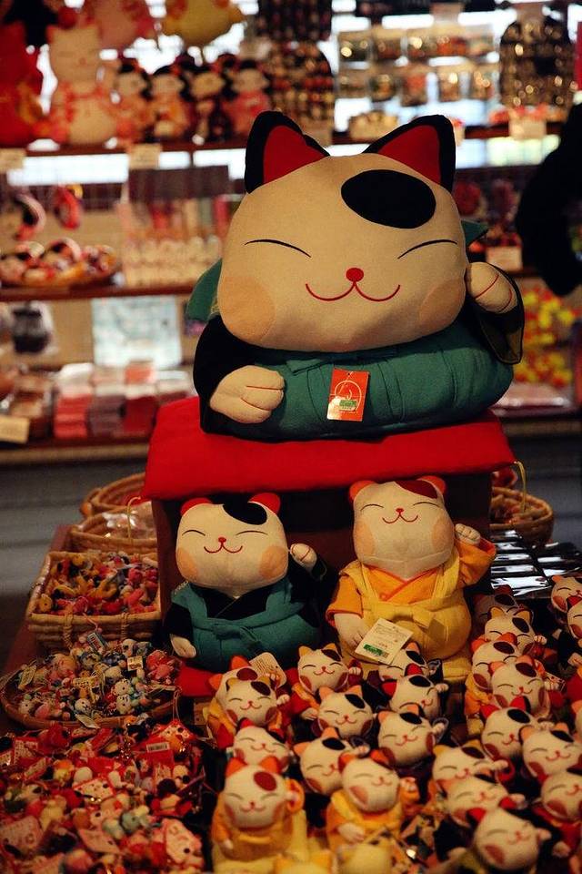 寺庙门口的店铺里卖各种猫咪的玩偶