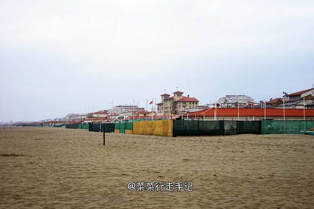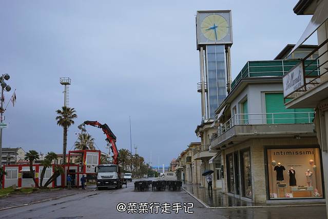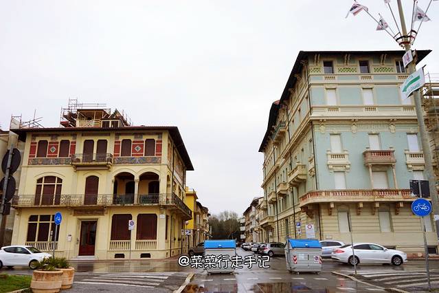 也许是因为春风未及,也许是因为正下着雨,未开门的商铺街道显得十分凋敝萧条,而阴沉的天色也令街对面的一排古老建筑看起来破破烂烂,年久失修的惨淡模样。于我看来,维亚雷焦的时间好像停留在了上个世纪90年代,包裹它的躯壳从里向外散发着不景和衰败气息。