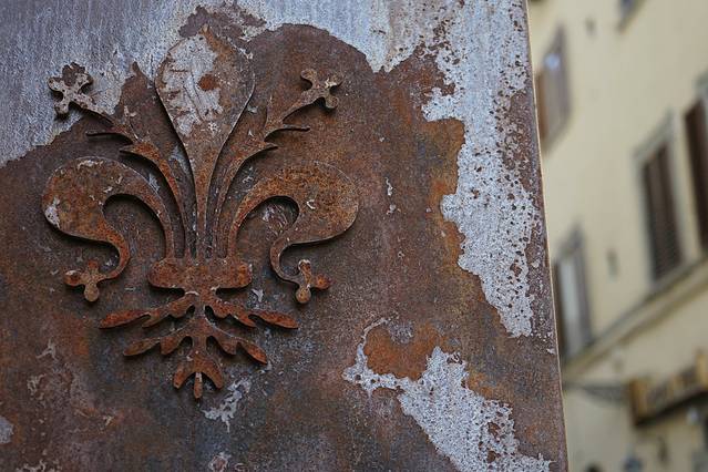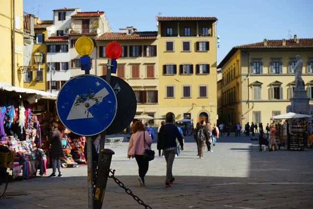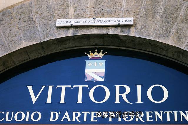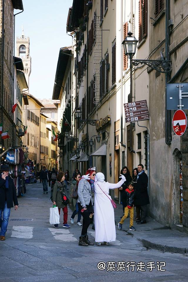 我们并没有机会入内参观,装备妥当,我们跟随地陪离开圣十字广场,又钻入小巷。一些行为艺术装扮的人开始有意接近我们,地陪立即提醒我们看好钱包,最好不要跟他们接触,话音未落,已经有个团友中招,付了几欧小费出去。经过广场旁的商铺,地陪指着一家门脸,“注意看,那里有一道标记。1966年,阿诺河淹没了大部分佛罗伦萨,其中也包括圣十字圣殿在内。大水裹着污物冲进了教堂。”我们纷纷惊叹大洪水的破坏程度,以及淹没的高度,“成威尼斯了”,团友们开着玩笑。