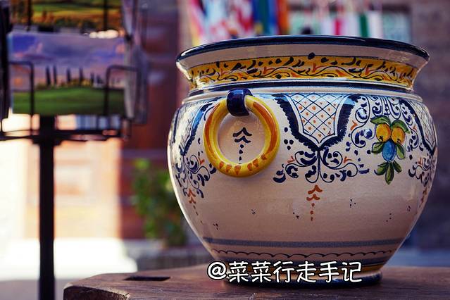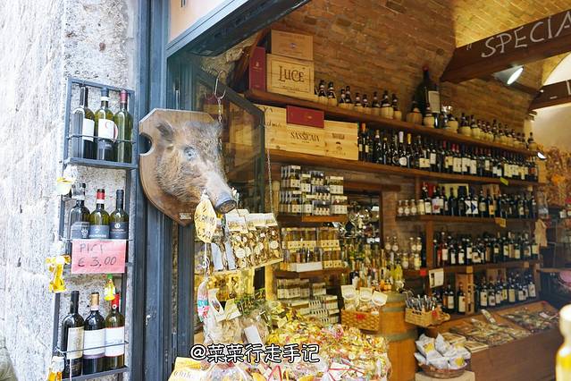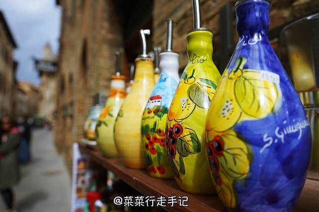 从各家店铺里贩卖的商品能猜出此地的特产是什么,比如店铺外挂着长獠牙的野猪头标本,排列着色彩斑斓的彩釉瓷瓶和彩绘盘子,间歇的酒香四溢。没错,明星产品是火腿肉、藏红花和一款叫Vernaccia的白葡萄酒。