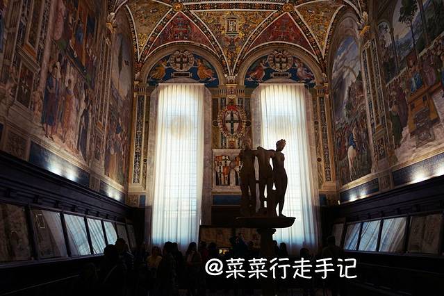 我们没去的桥的另一头,连接着维奇奥宫。五百人大厅中乔治奥•瓦萨里的《马西阿诺之战》壁画顶部附近,被发现有cerca trova几个小字。主流观点认为瓦萨里暗示在壁画所在墙后面三厘米缝隙里,藏着一幅失踪的达芬奇的壁画。