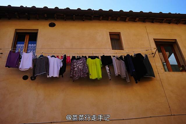 我们三三两两地在教堂门口的大台阶上拍照,然后换各种姿势和背景拍照。我也拜托地陪帮我拍了一张“到此一游照”——我出发前就想好的,每个地方只要有一张人像就够了。地陪带我们钻进了清净的小巷子,远离游客的据点,这才发现原来居民住宅的窗外是彩色的床单在飘扬。不禁哑然失笑,在如此色调单一的建筑群中,连床单都那么上镜。原来意大利人跟我们一样,也大庭广众之下“公然”晒床单和衣物。