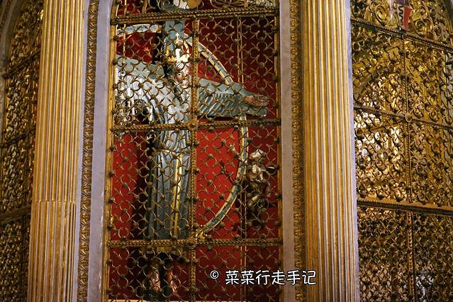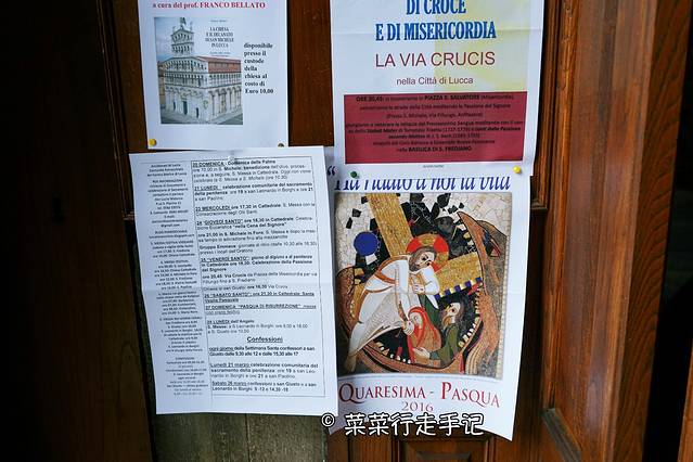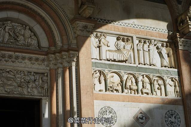 卢卡城中的教堂很多。我们在去往城墙的路上又进了其中一座以圣马丁命名的教堂(duomo de san martino)。一楼中央门道附近有描述“每月的劳动”浮雕,显示每季需做的劳务,最右边是“9月的劳动:打谷”。中殿中间由当地雕刻家建造有金色雕花的八角形小教堂(Tempietto,1482-1484),里面藏有一座木制十字架Volto Santo-耶稣被钉死在十字架上的雪松木苦像,据说是Nicodemus在11世纪时雕成这座十字架的,实际上可能是8世纪原作的13世纪仿制品。这座小礼拜堂不对外开放,只能透过雕花门窗观看,游人只要投入硬币,就会开灯照射,整座小礼拜堂便在闪闪金光之下。