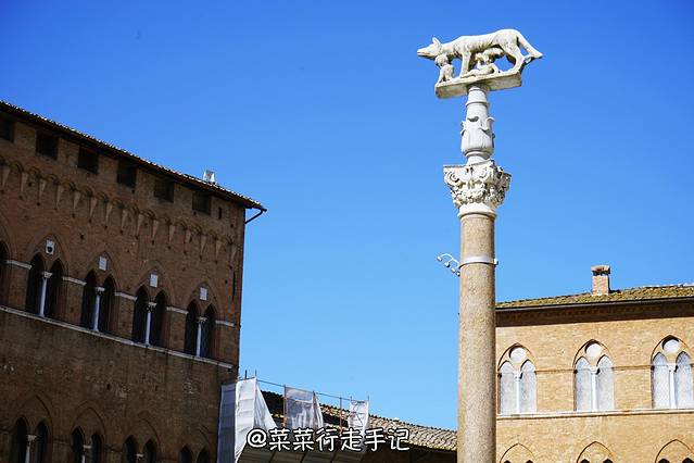 爬上最后一段高石阶,锡耶纳大教堂出现在众人面前。它的立面非常精致华丽,有着明显的哥特建筑繁复的风格,下部的大门则是罗马风格。在教堂前的立柱,顶部是与罗马的象征相同的母狼喂子雕像,传说锡耶纳也是由王子的后人所建。教堂表面镶嵌黑白相间的大理石(严格来说是墨绿色),更显深沉,我认为更加耐看。众人在此拍了合影照片,便四散自由活动。