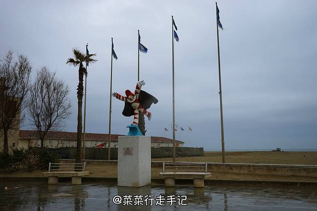 走在街上,我又有了其他的发现。每根路灯都插着小丑图案的旗帜,我进一步猜测,这里可能举办过一个活动,而小丑可能是这届活动的吉祥物。待我们走到湿漉漉的海滩广场,一尊小丑雕像令我纠正了一下答案,它看上去不是新立在那里的,所以应该不仅仅是某个活动的吉祥物,而且也是这座城市的代表。它是谁呢?我暂时没有答案。