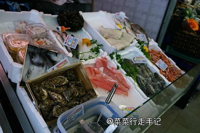 边走边聊,接着就与一个小菜市场不期而遇了。摄影师和美食家立即进入工作状态,我也跟着拍了几张。菜市场好小,占了街区的一个小角而已。纵伸不过两条径,几家摊档,却色彩斑斓,生鲜皆俱,互补有余。我们钻进去市场,仔细看看究竟卖何蔬菜瓜果,是深受意大利人喜爱的餐桌上的常见菜,模样古怪的有棱西红柿、比花还娇俏的洋蓟、头顶鲜艳的嫩南瓜、紫色花纹的菊苣,还有当季的红橙、啤梨和桔子。两步之外则是海鲜档,除了即开的生蚝,冰鲜鱼种类还挺丰富,我反正认不全。香料、调料、奶酪、酱菜和腌制食品一应俱全。想象着愉快地买好菜,顺便捧一束鲜花回家,正是曼妙生活啊,可比逛超市要好玩几分。