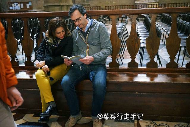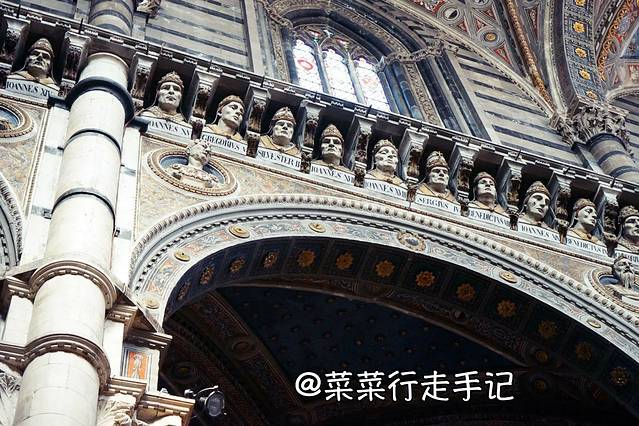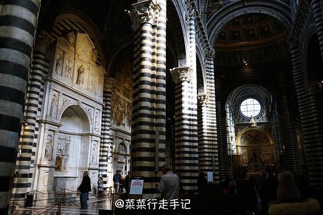 时间只有1小时,脱团三人组一致同意入教堂参观。我看过的教堂不下百座了,但仍会为锡耶纳大教堂的独特魅力而折服。且不说精美的壁画和华贵的穹顶,单是黑白两色的运用,就令人着迷——黑白色线条有时会渐渐隐入自然光线不能企及的角落,引人入胜,仿佛上天的神秘力量。三人也都更欣赏这教堂的素雅黑白风格。